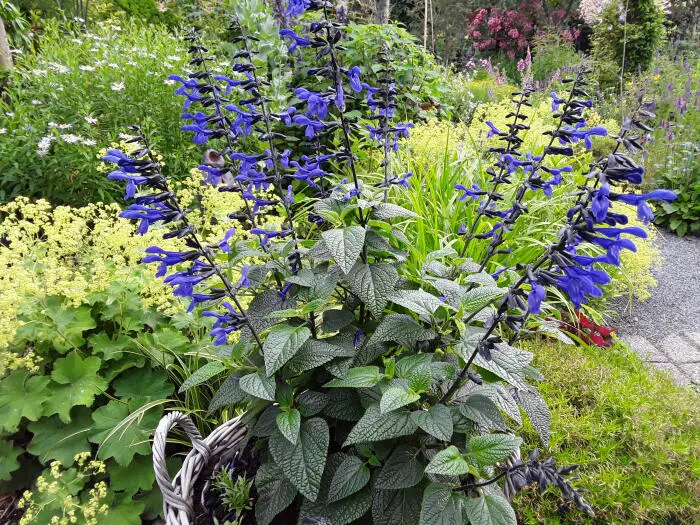 Blüht an schwarzen Stängeln mit dunkelblauen, röhrenförmigen Lippenblüten und einem blau-schwarzen Kelch.