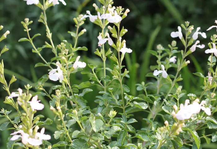 Salvia microphylla 'Glacier' ist ein kleinblättriger Salbei mit reinweißen, trompetenförmigen Blüten.