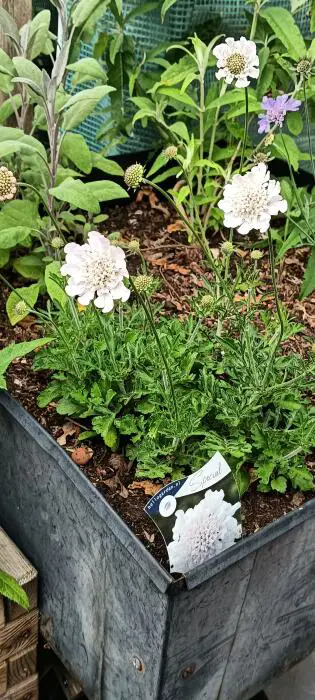 Scabiosa columbaria 'FLUTTER Pure White' ist eine kompakt wachsende, zwei- bis kurzlebige verzweigte Pflanze mit reinweißen, gut gefüllten Blütenköpfen.