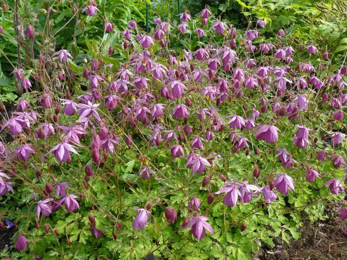 Semiaquilegia ecalcarata ähnelt einem gewöhnlichen Akelei, weist jedoch keine Sporen auf dem Blütenrücken auf. Die nickenden Blüten stehen auf geraden Stängeln und blühen in violetten bis rotvioletten Tönen.