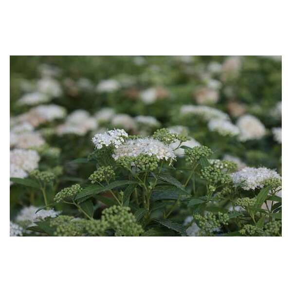 Spiraea japonica 'Albiflora' ist ein kompakter Strauch mit aufrechten Stängeln und ovalen, gezackten hellgrünen Blättern mit graugrünen Unterseiten.