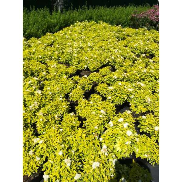 Spiraea japonica 'White Gold' ist ein robuster, kompakter, buschiger Strauch mit runder Form und kleinen, verlängerten, leuchtend goldgelben Blättern.