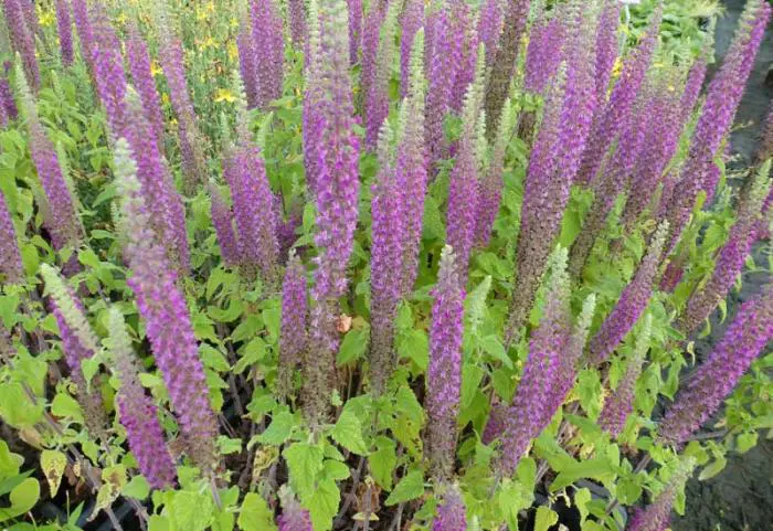 Blüht mit langen, schlanken Spitzen aus violett-violetten Blüten, die über das Laub hinausragen.