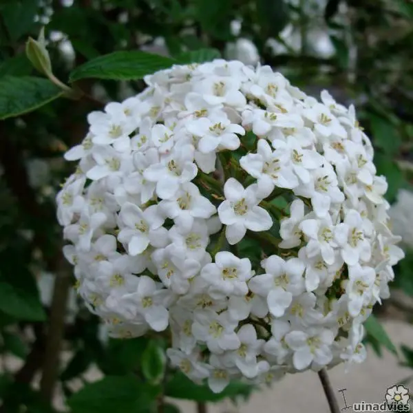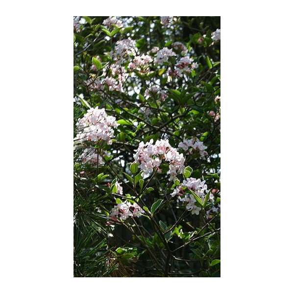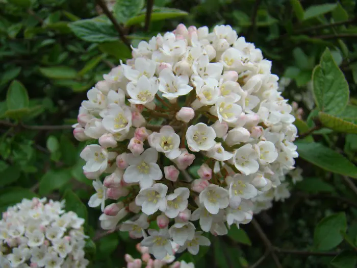 Viburnum x burkwoodii bildet einen runden, buschigen Strauch und blüht mit duftenden weißen Blüten aus rosa Knospen; der berauschende Duft erinnert an Orangenblüten.
