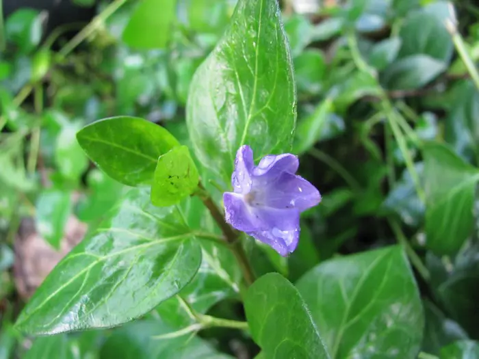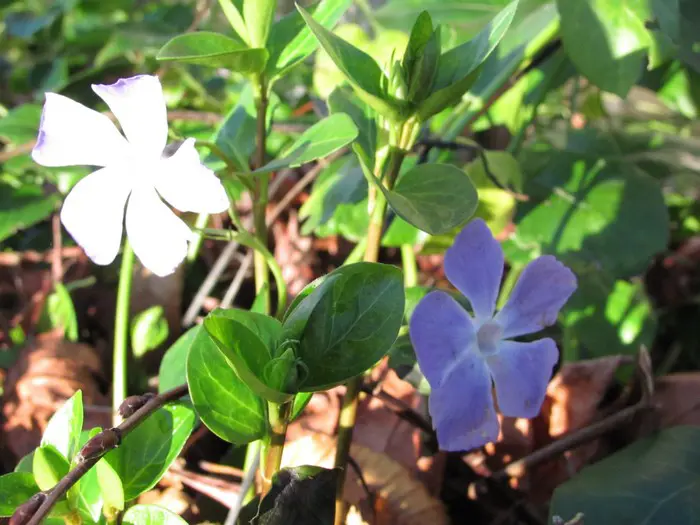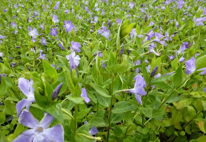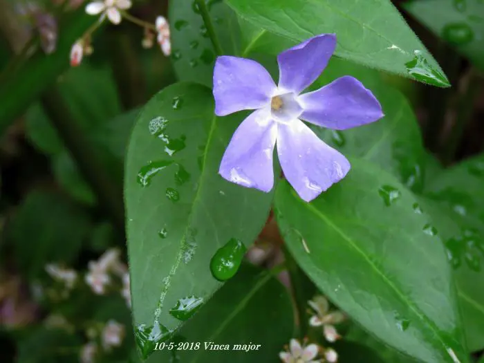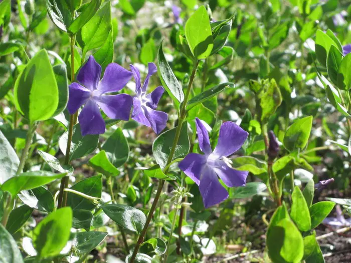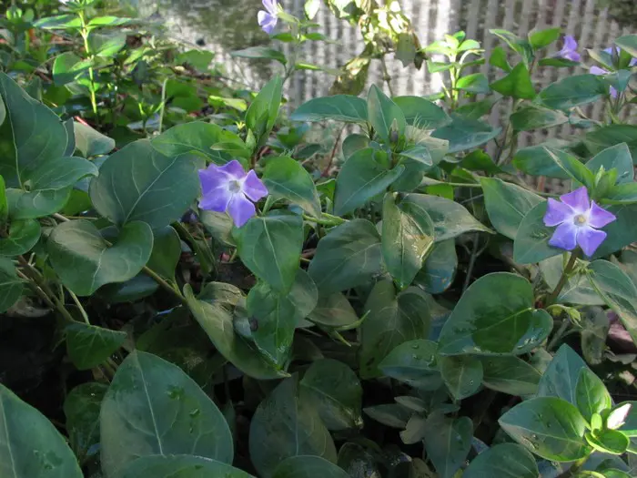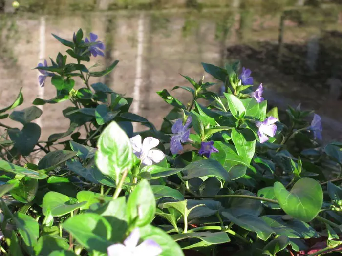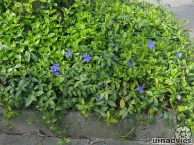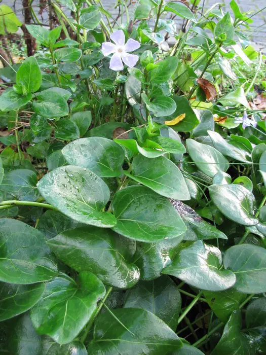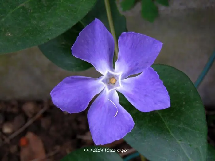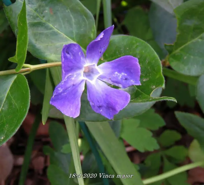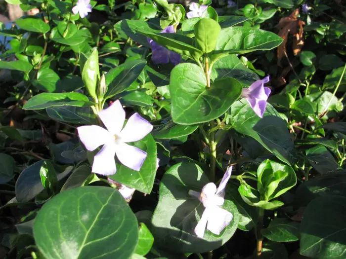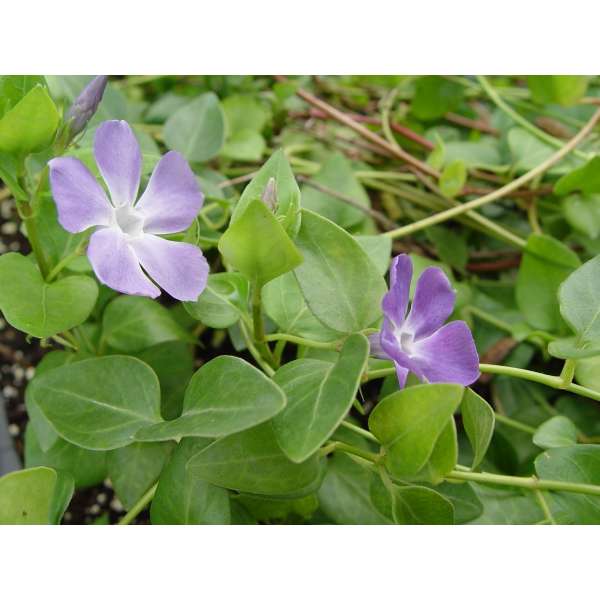Vinca major ist ein kräftiger Bodendecker mit herzförmigen, ledrigen, glänzend grünen Blättern und einer üppigen Blüte aus wunderschönen, sternförmigen, violett getönten blau-grauen Blüten.