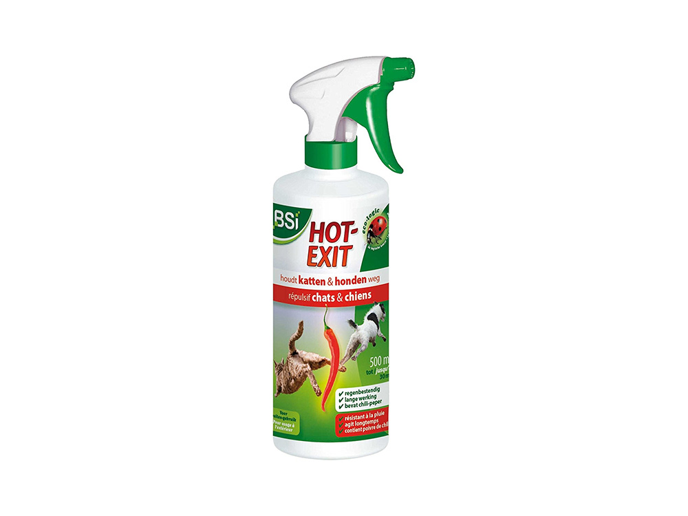 BSI Hot-Exit ist ein regendichter Spray mit langer Wirkung. Das Produkt schreckt Katzen und Hunde ab und verhindert unerwünschte Verschmutzung in den behandelten Bereichen. Sowohl für aufrechte als auch für flache Behandlungen. Wird mit Regen viel weniger weggespült als Granulate oder klassische Sprühsprays. Der Kontakt mit der behandelten Oberfläche verursacht eine vorübergehende Reizung bei den Haustieren, sodass sie diese Orte oder Wege meiden.