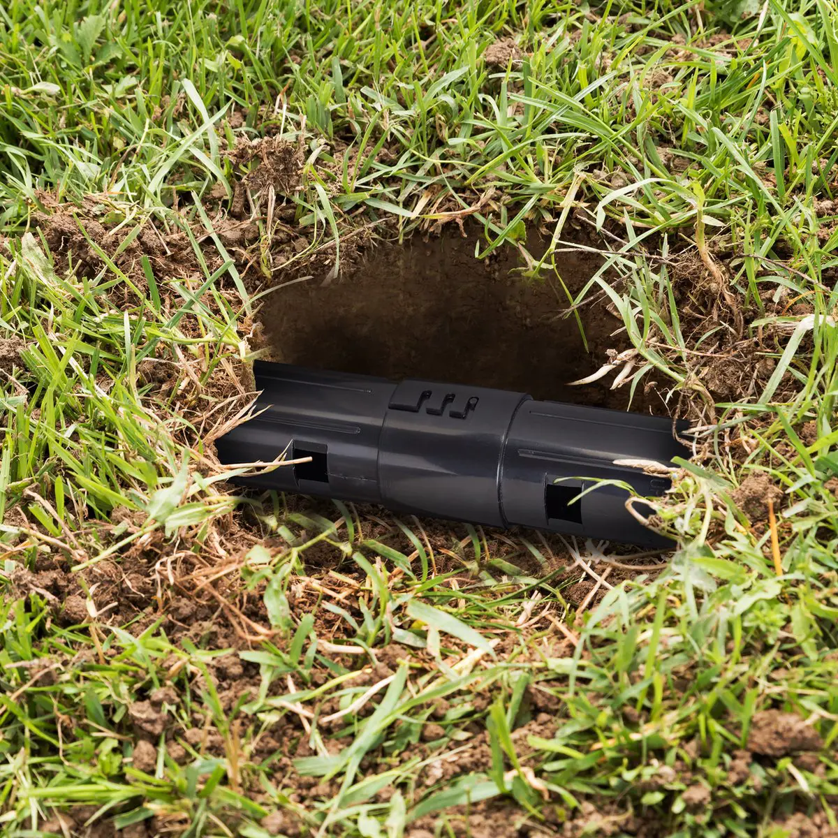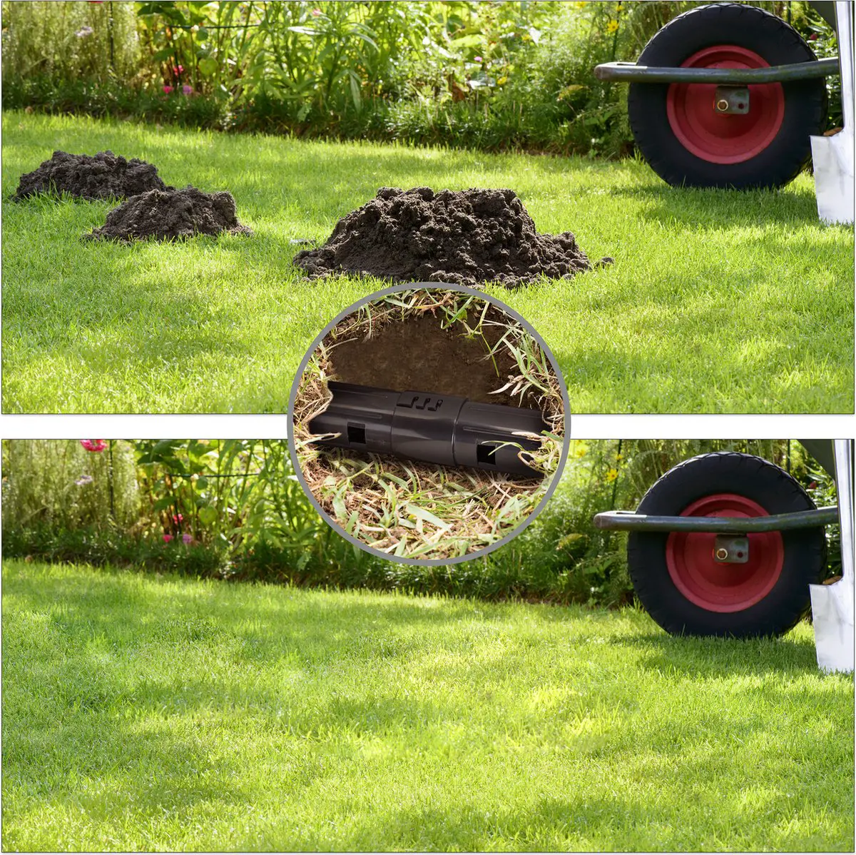 Die Falle ist leicht zu platzieren. Man muss nur ein Loch im Maulwurfstunnel graben und die Maulwurfsfalle mit den Öffnungen nach oben platzieren. Decken Sie die Maulwurfsfalle mit einer Kachel oder einem Ziegel ab, damit Sie immer über die beiden Kontrollplätze überprüfen können, ob ein Maulwurf gefangen wurde.