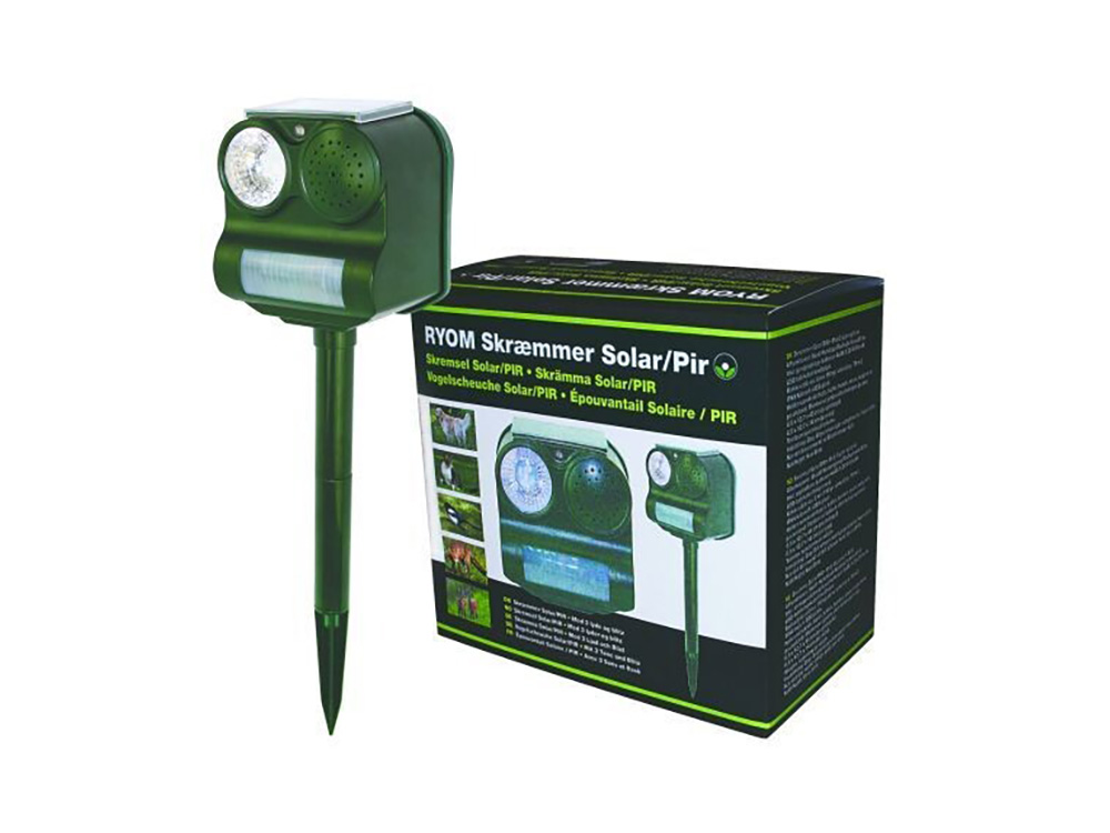 Solarenergieabwehrer zur Abschreckung unerwünschter Tiere im Garten. Der solare Tierabwehrer erzeugt Licht und Geräusche wie Schüsse, bellende Hunde und Greifvögel. Halten Sie Katzen oder Vögel von Ihren Obstbäumen, Blumenbeeten oder Teichen fern.