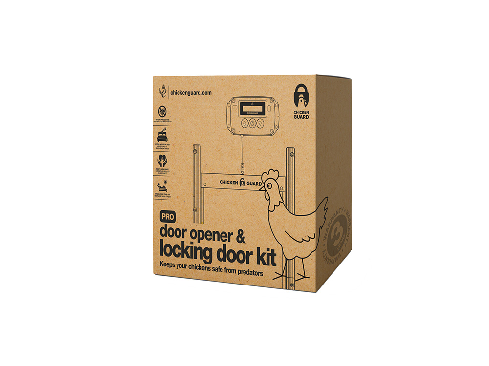 Diese Version von Chickenguard Pro ist ein selbstschließendes Türset für Hühner- oder Geflügelstalle. Er enthält einen automatischen Türöffner und eine passende Aluminium-Schiebetür, die die Hühner nachts vor Füchsen und anderen nachtaktiven Raubtieren schützt. Die selbstschließende Tür verfügt über innovative selbstschließende Flügel. So können die Krallen der Raubtiere die Hühnerstalltür nicht öffnen.