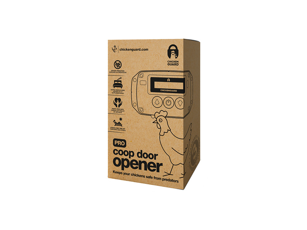 Dieses Gerät hält Raubtiere und andere unerwünschte Gäste fern. Die Hühner sind geschützt und die Eier werden nicht mehr auf diese Weise gestohlen. Sie können dieses Gerät ganz einfach selbst an bestehenden Schiebetüren montieren. Chicken Guard enthält eine Anzeige (LED), die zeigt, dass die Verschiebeluke geschlossen ist; das Erkennungszeichen ist schon aus 100 Metern Entfernung sichtbar.