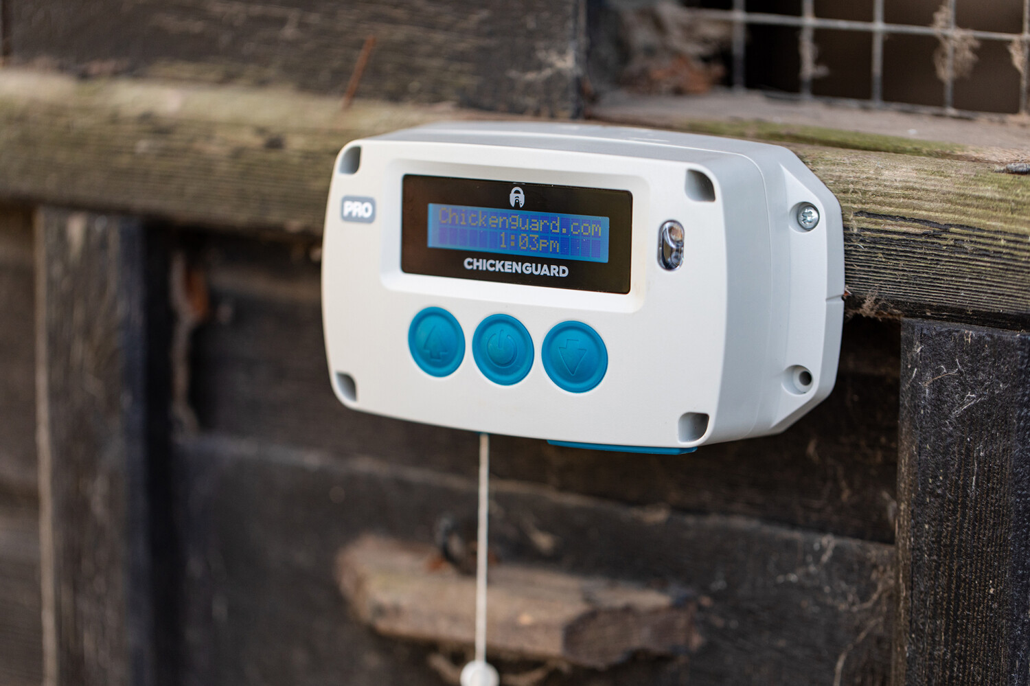 Der Chicken Guard Pro Türöffner ist ein praktisches Gerät zum automatischen Schließen von Nachtstallen für Hühner und anderes Geflügel. Du kannst es über die Timer-Funktion oder den verstellbaren Lichtsensor programmieren.