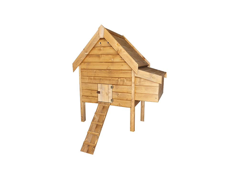 Diese Hühnerställe stehen auf hohen Beinen und haben einen langen Gang zum Komfort der Hühner. Das Legnest ist mit zwei separaten Zonen ausgestattet und kann je nach Vorliebe sowohl auf der linken als auch auf der rechten Seite montiert werden. Sowohl der Boden des Leg-Nests als auch der des Stalls bestehen aus hölzernen OSB-Brettern. Zusätzlich stehen zwei abnehmbare Holzsitzstangen zur Verfügung, auf denen die Hühner bequem ausruhen können.