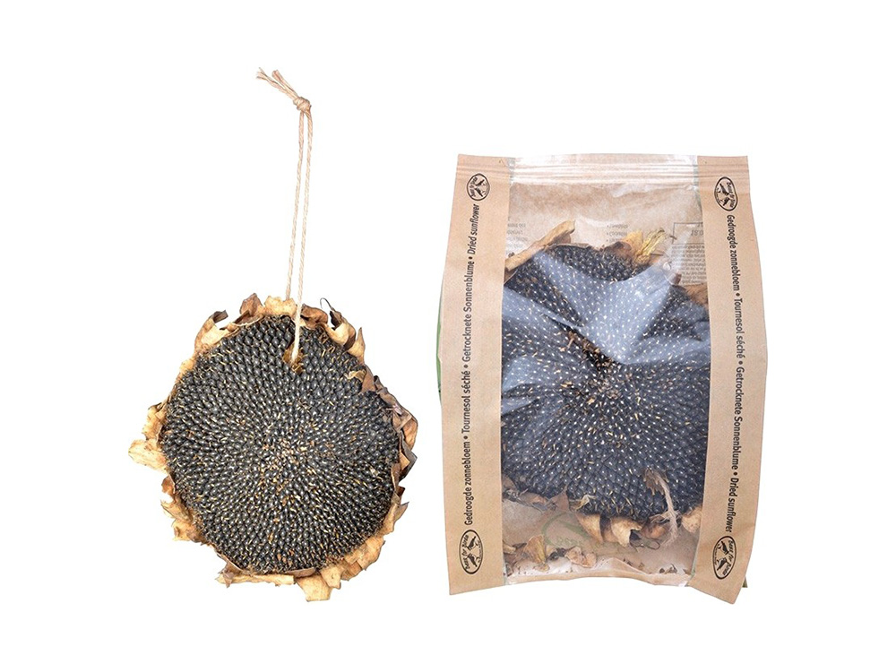 Der Sonnenblumenkopf ist in der Sonne getrocknet, sodass die Vögel die Samen leicht erreichen können. Mit dem mitgelieferten Juteseil ist das Aufhängen ein Kinderspiel. Hängen Sie die Sonnenblume an einen Futterhaken, in einem Busch oder auf den Balkon und genießen Sie die festlichen Vögel.