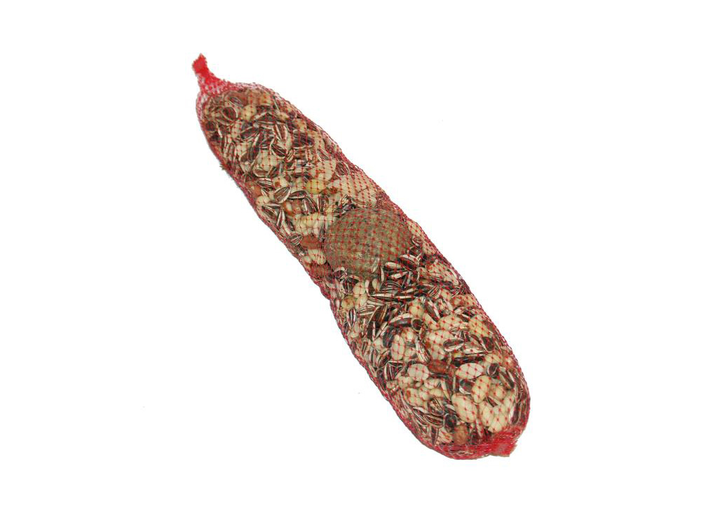 Eine Futtergirlanda mit einer Auswahl an Sonnenblumenkernen, Erdnüssen und fetten Erfrischungen, eingewickelt in ein Netz. Hängen Sie das Netz mit dem Futter an einem strategischen Ort abseits von Katzen und anderen Raubtieren, damit die Vögel das Futter sicher und leicht genießen können.