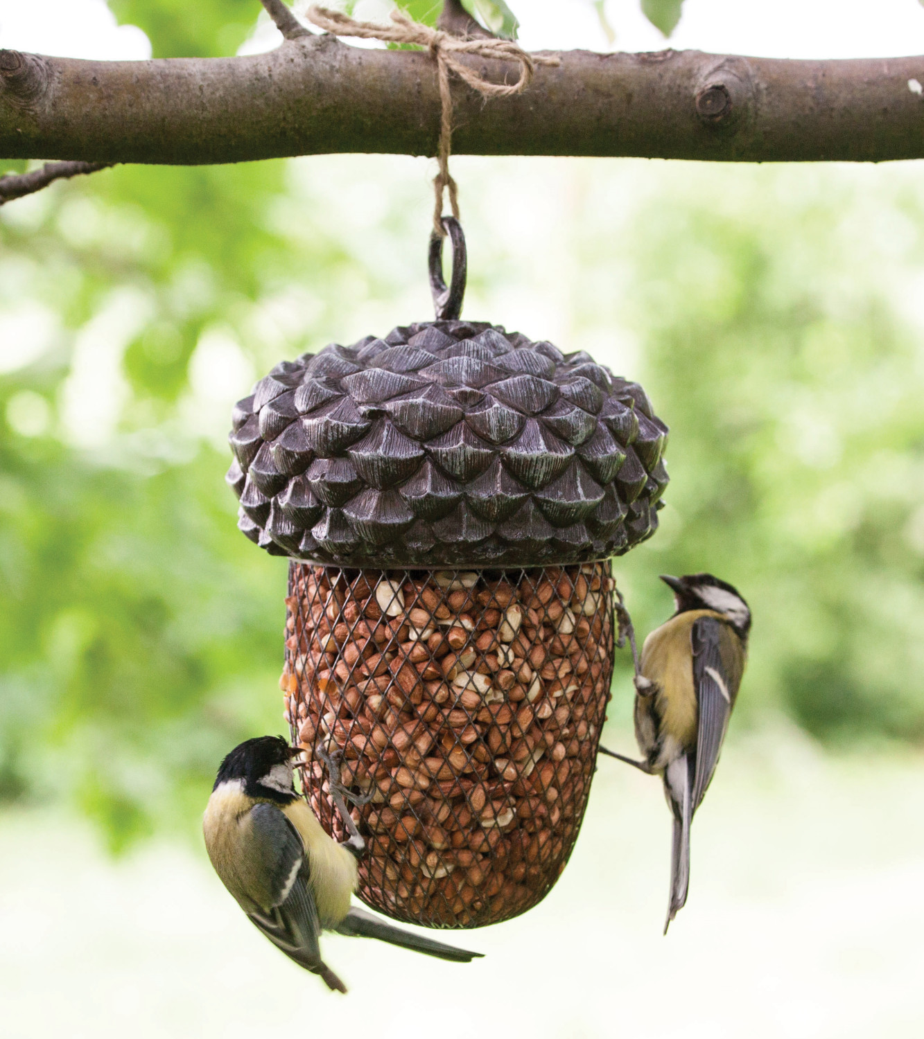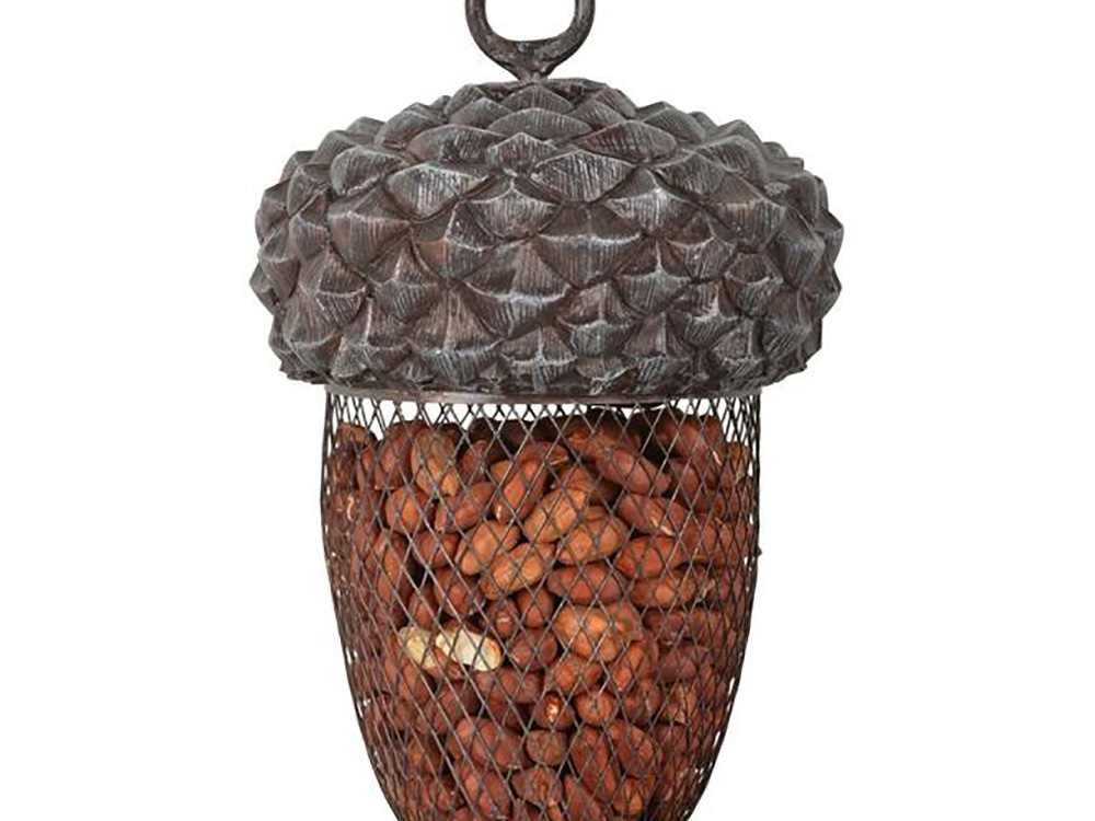 Eicheln sind eine wichtige Nahrungsquelle für viele Tiere wie Eichhörnchen und Vögel. Diese riesige Eichel ist nicht essbar, dient aber als ursprünglicher Behälter für Erdnüsse, Sonnenblumenkerne und andere Nüsse , die viele Vögel in Ihren Garten locken.