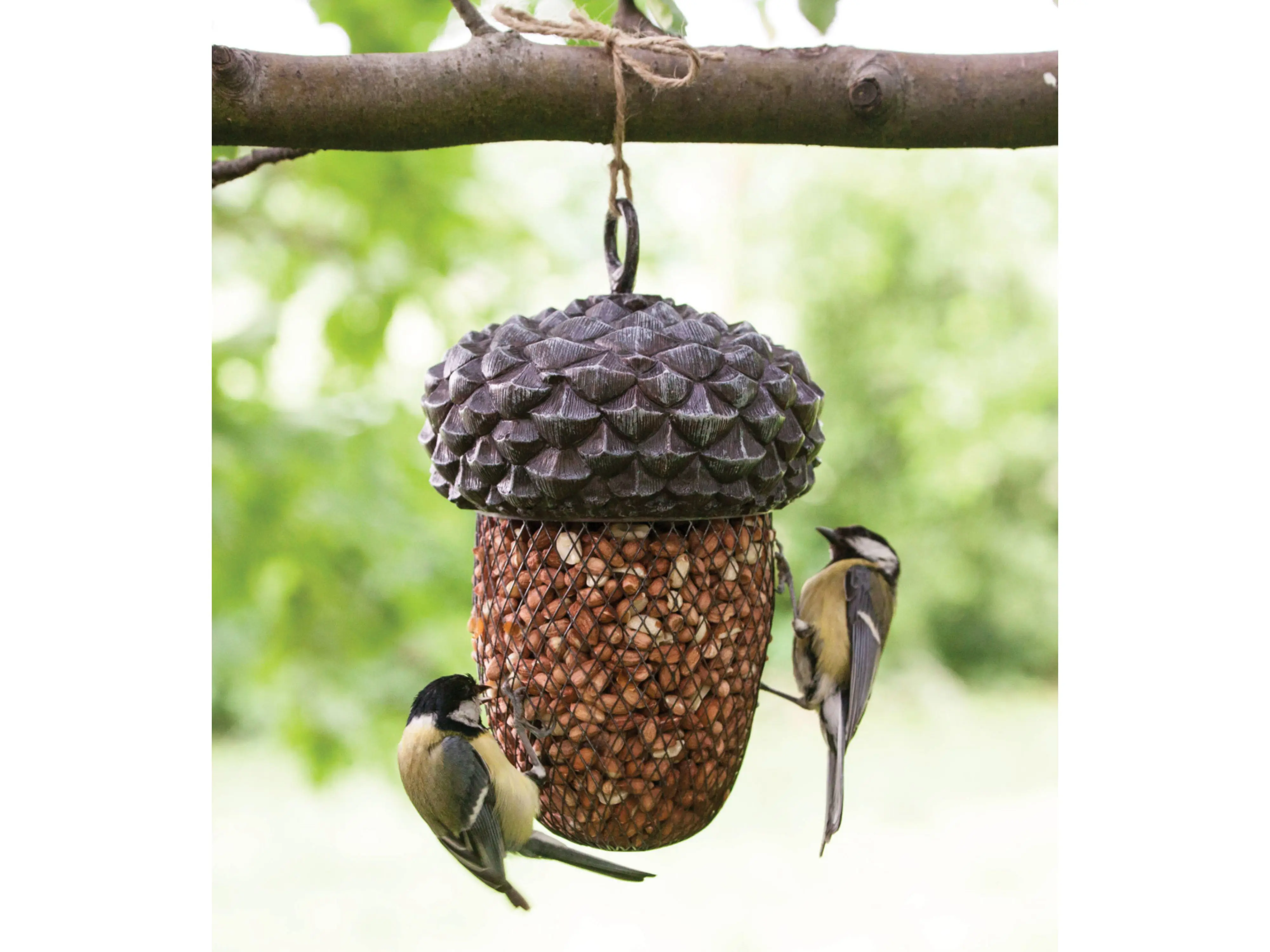 Durch das Abschrauben des Hängerings kann der Deckel entfernt und der untere Teil leicht mit Futter gefüllt werden. Mit dem stabilen Ring kann man die Eichel an einen Baum, Strauch oder Futterhaken hängen.