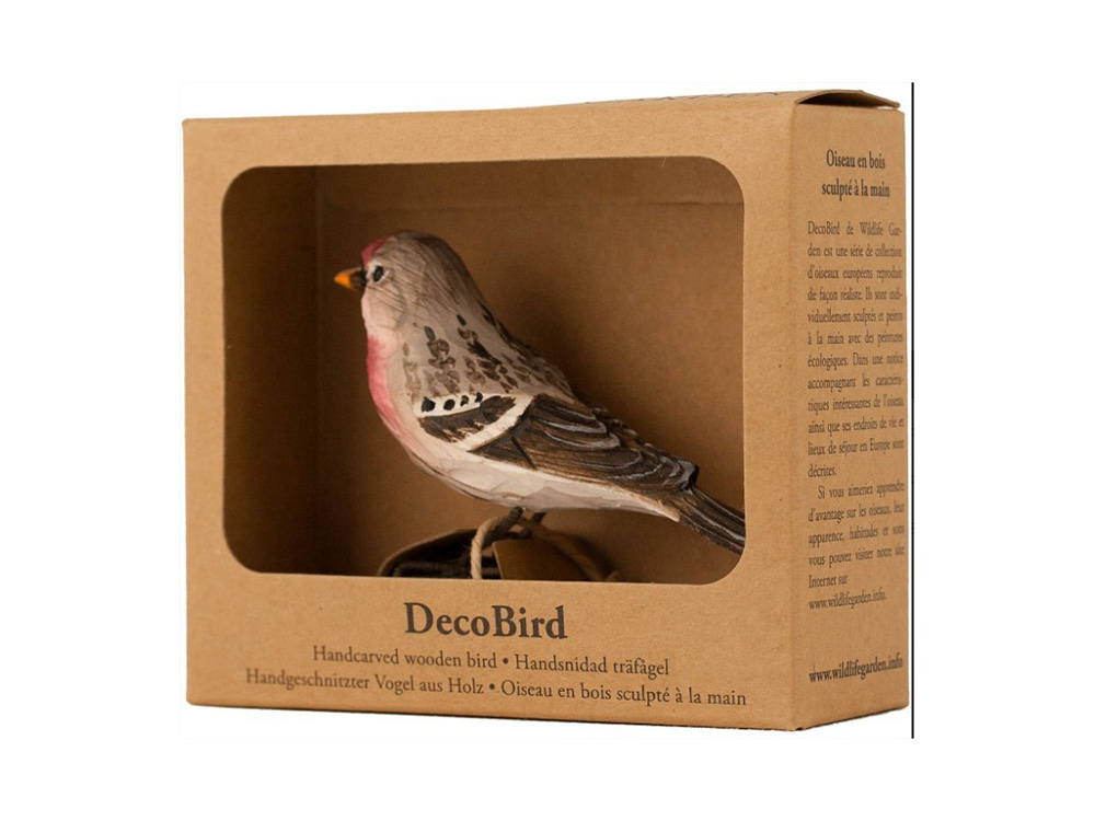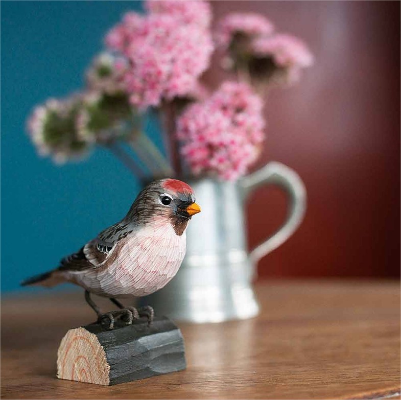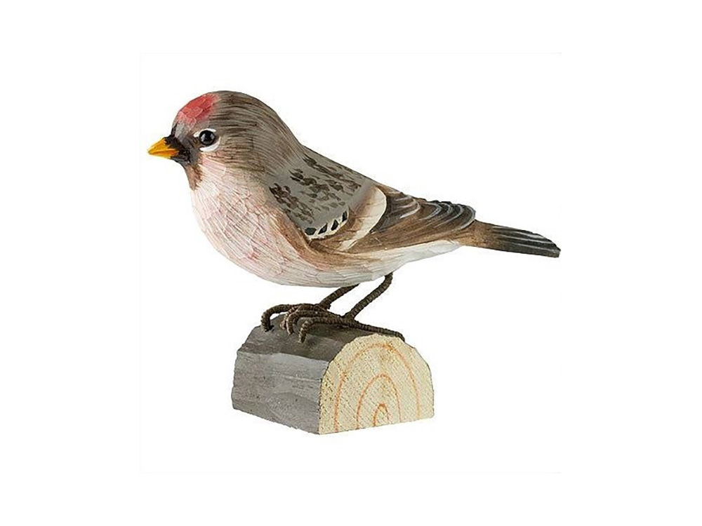 Kunsthandwerklich gestaltete Holz-Rotpoll ( Carduelis flammea). Der Rotpoll ist lebensgroß gestaltet und mit umweltfreundlicher Farbe bemalt.