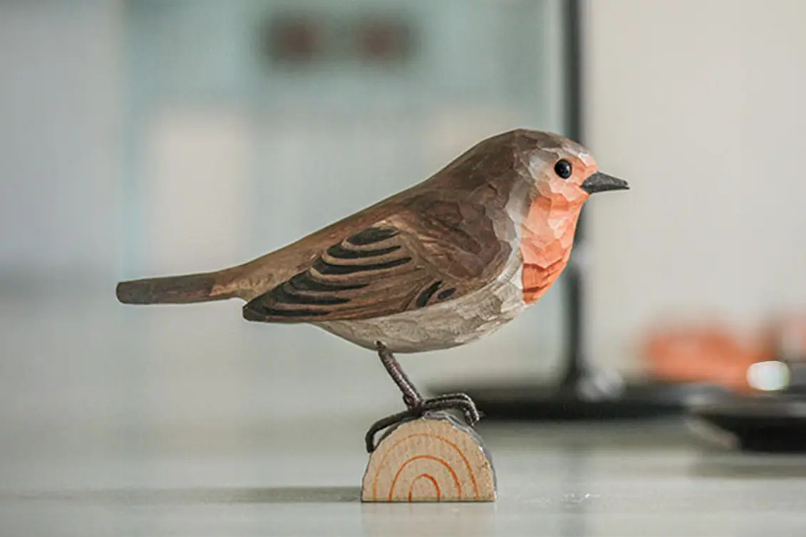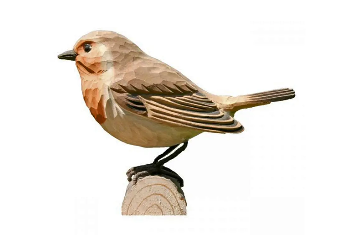 Traditionell entworfenes hölzernes Rotkehlchen, in Originalgröße verputzt und mit umweltfreundlicher Farbe bemalt.Diese Holzskulptur ist ein wunderbares Geschenk für jeden Gärtner oder Pfleger! Ein Stock wird bereitgestellt, mit dem der Vogel zur Dekoration in einen Blumentopf gesteckt werden kann.