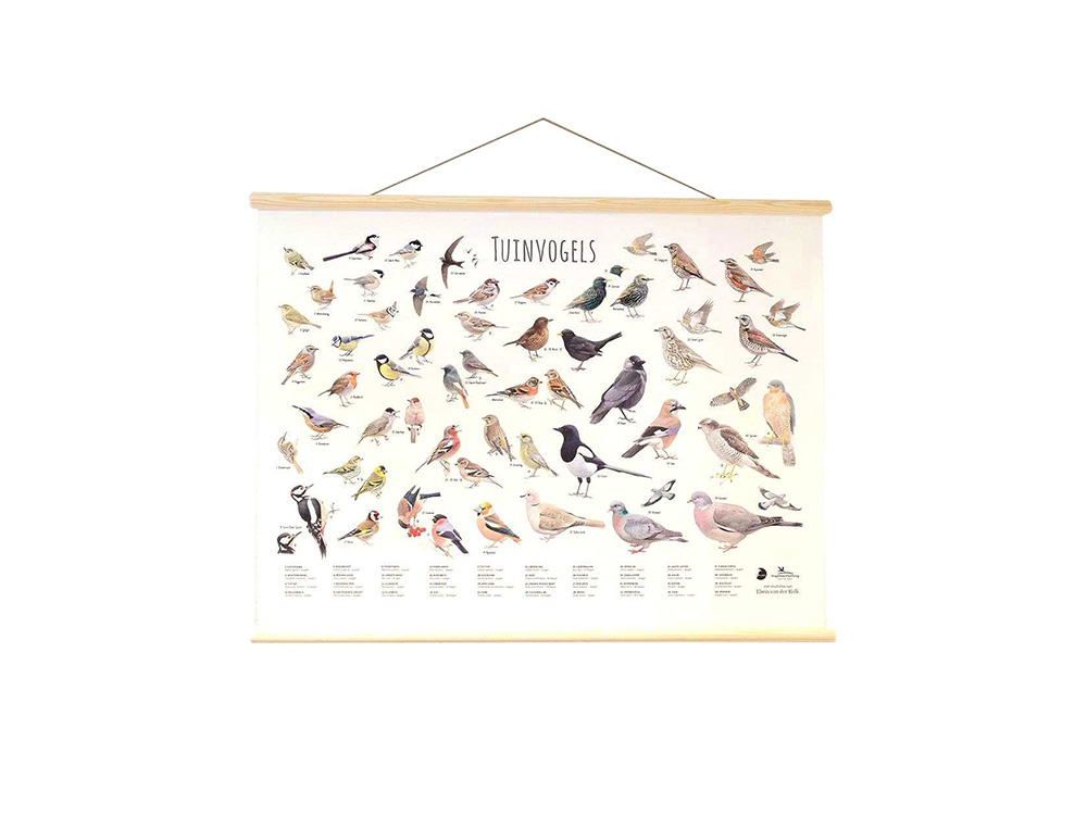 Wunderschönes Wandtuch mit 40 detaillierten Illustrationen von Gartenvögeln von Elwin van der Kolk.