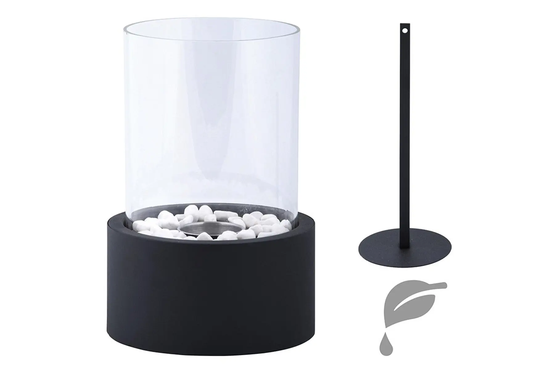 Der Sockel des Kamins besteht aus Metall mit einer schwarzen Beschichtung, in der der Brenner ruht. Die Flamme ist von einer Glasglocke umgeben, die oben offen ist, und die beigelegten weißen Steine sorgen für eine dekorative Note.