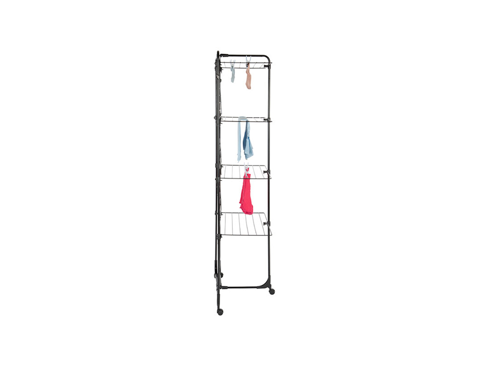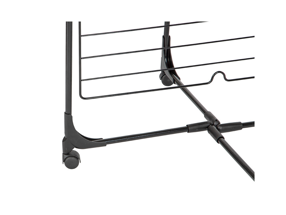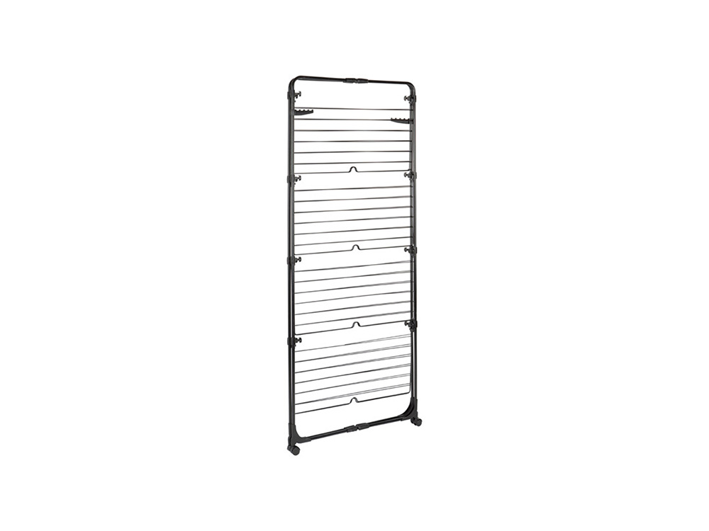 Der schwere Trocknungsturm Sara ist ein Trockengestell mit 4 Ebenen und 8 separaten Regalen. Er ist außerdem halb zusammenklappbar und kann an einer Wand eingesetzt werden. Das Trockengestell steht auf vier stabilen Rädern, sodass man es leicht bewegen kann. Mit der 40-Meter-Trocknungslinie hat man sofort eine große Trocknungsfläche. Oben sind zwei Hänghaken für Kleiderbügel angebracht.