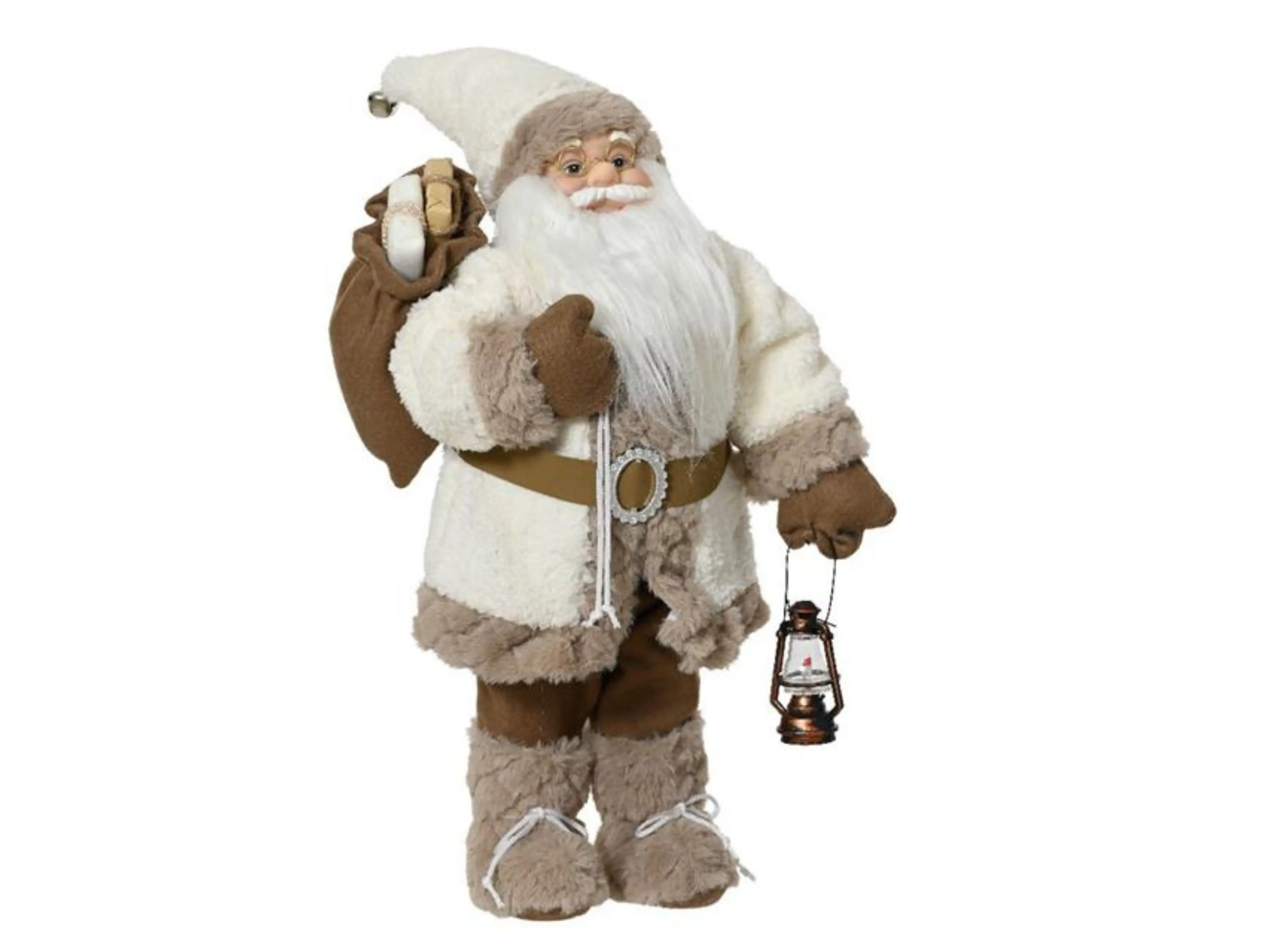 Der Weihnachtsmann besteht aus robustem Polyester und hat einen Kunststoffkörper, der ihn stabil und leicht zu bewegen macht. Sein Outfit wird ergänzt durch eine Stoff-Geschenktüte, eine Papier-Geschenktüte und eine bronzene Laterne – perfekt, um eine magische Atmosphäre im Wohnzimmer, Flur oder am Weihnachtsbaum zu schaffen.