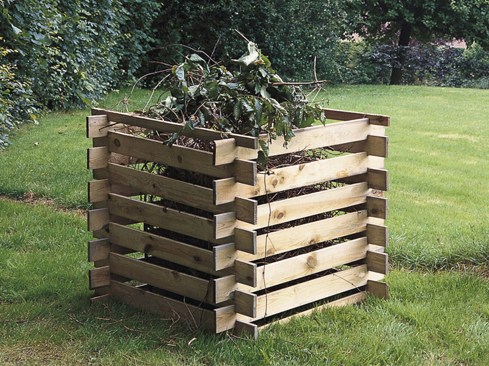 Kompostbehälter in Kiefernholz zur Verarbeitung von Garten- und Küchenabfällen. Die einzelnen Planken fügen sich über ein Nut-und-Feder-System zusammen, sodass dieses Kompostsilo sehr schnell aufgebaut werden kann.