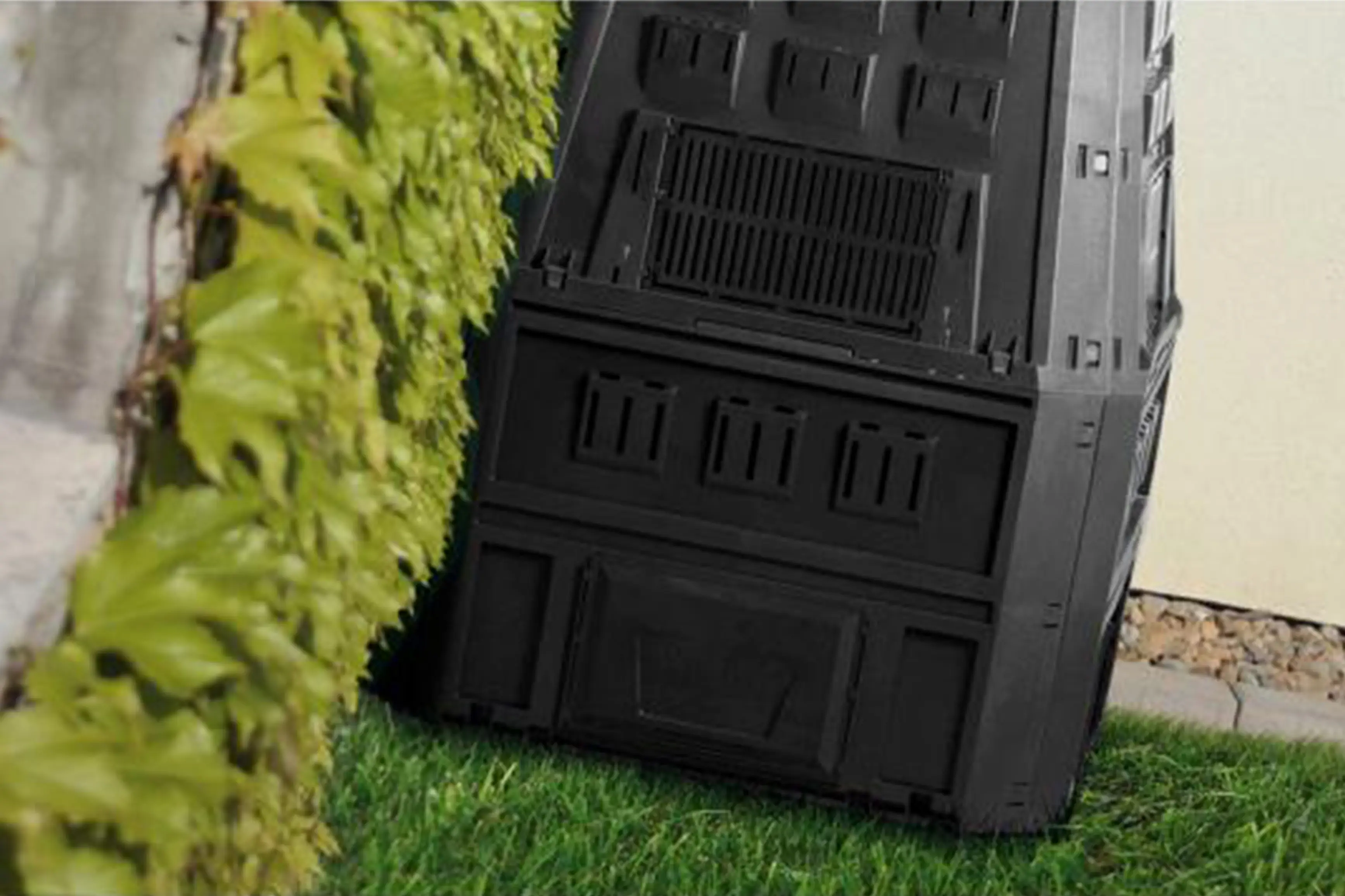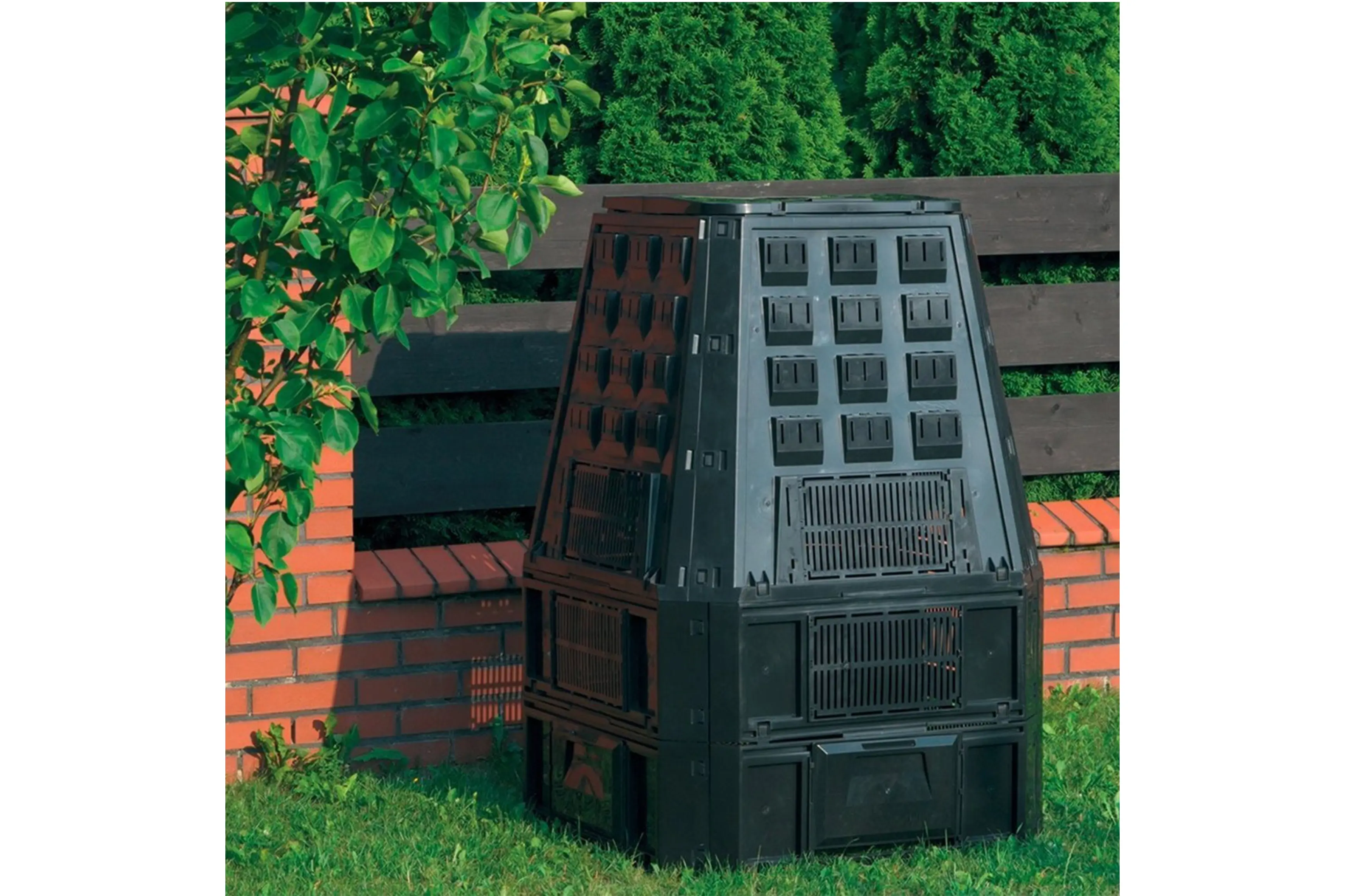 Schwarzer Kompostbehälter mit einem extra großen Fassungsraum von 850 Litern, perfekt für Gemüse-, Garten- und Obstabfälle.