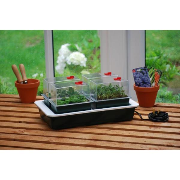 Züchten Sie Blumen, Gemüse oder Kräuter drinnen mit diesem vierteiligen Vermehrungsgerät. Die elektrisch beheizte Saatschale ist mit einem 8 Watt beheizten Boden ausgestattet, der die Bodentemperatur um ca. 8° C erwärmt – ideal für eine schnellere Keimung und das Wachstum von Samen oder Stecklingen. Dieses einzigartige Modell ermöglicht es, mehrere Sorten in 4 separat belüfteten Gewächshäusern anzubauen.
