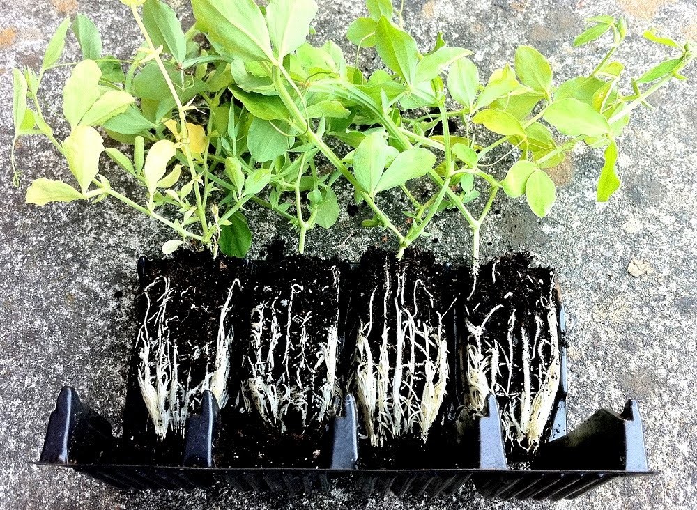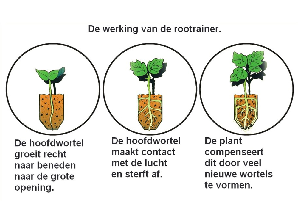 Das Prinzip ist einfach. In der tiefen Zelle erreicht die Hauptwurzel schnell das große Abflussloch am Boden und stirbt ab. Dadurch reagiert der Keimling und bildet zahlreiche seitliche Wurzeln, die wiederum schön durch die Rillen in den Zellwänden geführt werden. Das sieht man deutlich, wenn man die Zellmodule ausklappt.