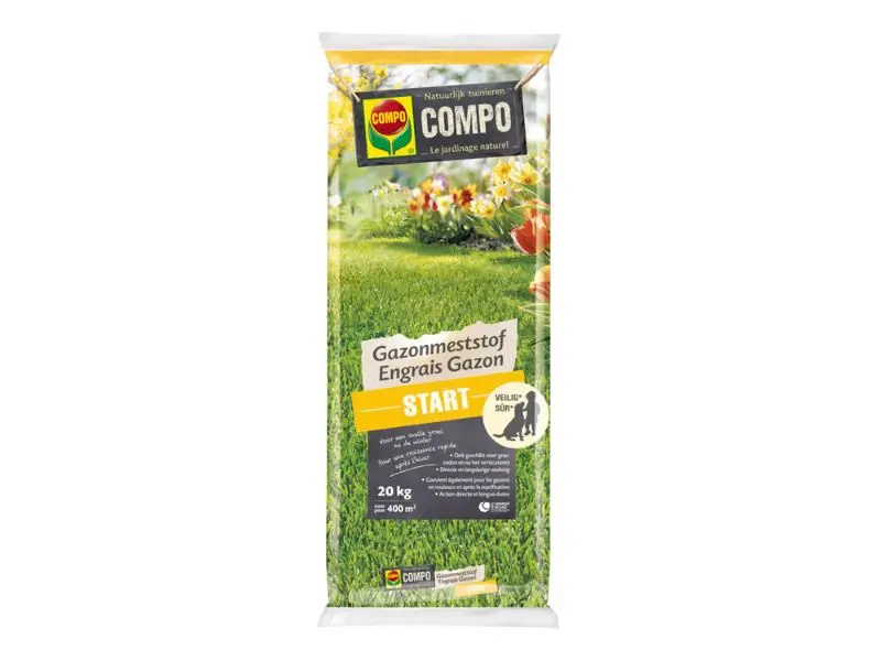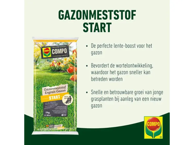 COMPO Lawn Fertilizer Start bietet Ihrem Rasen den perfekten Schub zu Beginn der Gartensaison! Wenn Ihr Rasen im Winter beschädigt wird, bietet dieser Dünger die Lösung. Darüber hinaus sorgt das Produkt für ein schnelles und zuverlässiges Wachstum junger Graspflanzen und eignet sich daher ideal zum Rasenlegen, zum Nachsäen oder zum Anlegen eines neuen Rasens. Die spezifische Kombination der Nährstoffe, die optimal auf junge Graspflanzen zugeschnitten ist, fördert die Wurzelbildung und Keimung und sorgt für einen dichten, stabilen Rasen.
