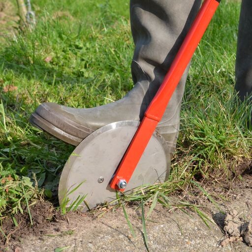 Das praktische Schneidrad ist robust gebaut. Man drückt das Rad vertikal in den Boden und schiebt es in einem Winkel von 30 bis 40° nach vorne. Das Schneidrad mit einem Durchmesser von 22,5 cm schneidet den Rasen am Grasrand bis zu den Wurzeln. Diese Bedienung ist dank des langen, ergonomischen Griffs von ca. 115 cm einfach.