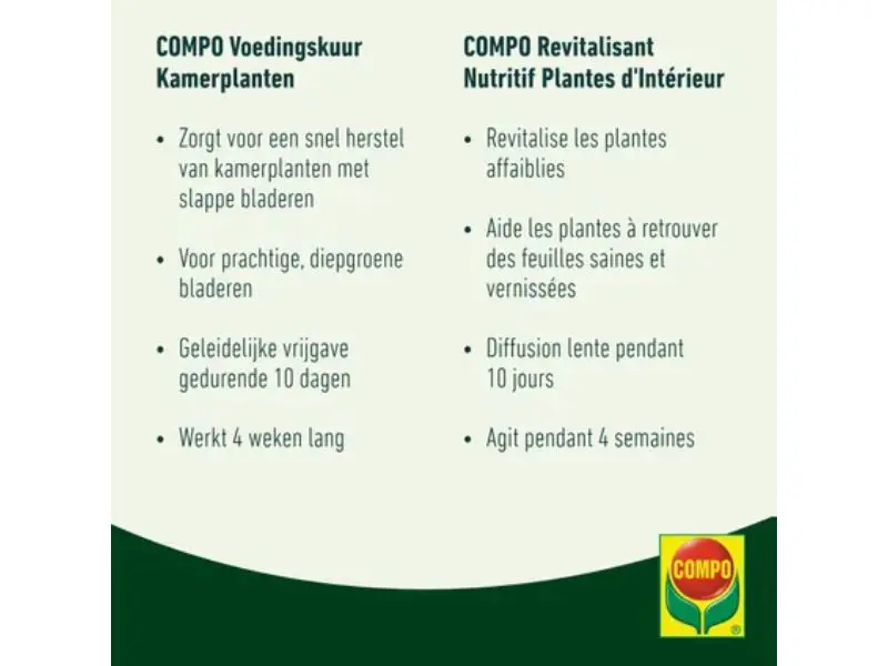 Die gebrauchsfertige Compo Recovery Cure Zimmerpflanzen ist ein vollständiges Schönheitsalter für alle Arten von Zimmerpflanzen (Ficus, Kautschukpflanze, Philodendron, Yucca und Farn). Das Produkt stellt geschwächte Pflanzen schnell wieder her und fördert Wachstum und Blüte. Eine Dosis reicht für einen 4-wöchigen Kurs aus. Die Dosierungen sind gebrauchsfertig: Dosieren oder Mischen mit Wasser ist nicht notwendig. Die Dosen enthalten alle wichtigen Nährstoffe, die über 10 Tage nach und nach freigesetzt werden.