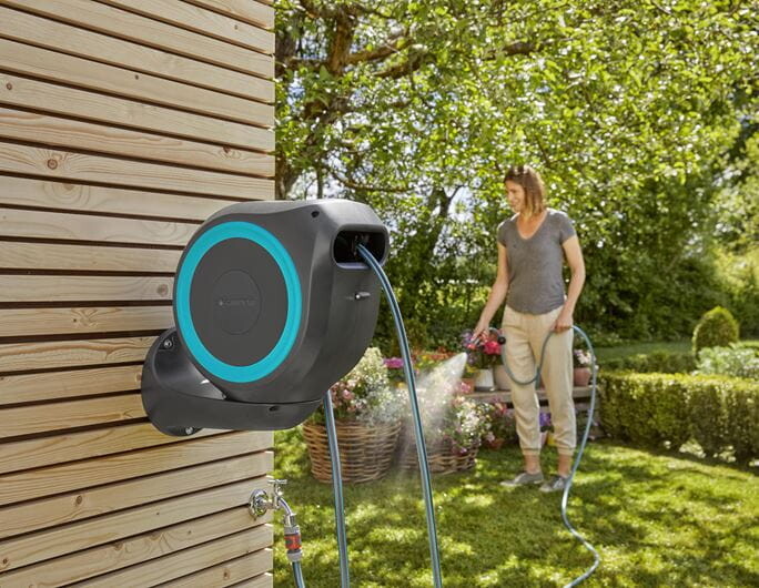 Dank der Schlauch- und Wasserhahnanschlüsse des Original Gardena Systems können Sie ganz einfach und flexibel eine Verlängerung oder ein anderes kompatibles Gardena-Element an den Schlauch anschließen. Schlauchaufsätze wie Düsen, Düsen und Waschbürsten können unter der Wandhalterung befestigt und aufbewahrt werden, sodass Sie sie immer griffbereit haben.
