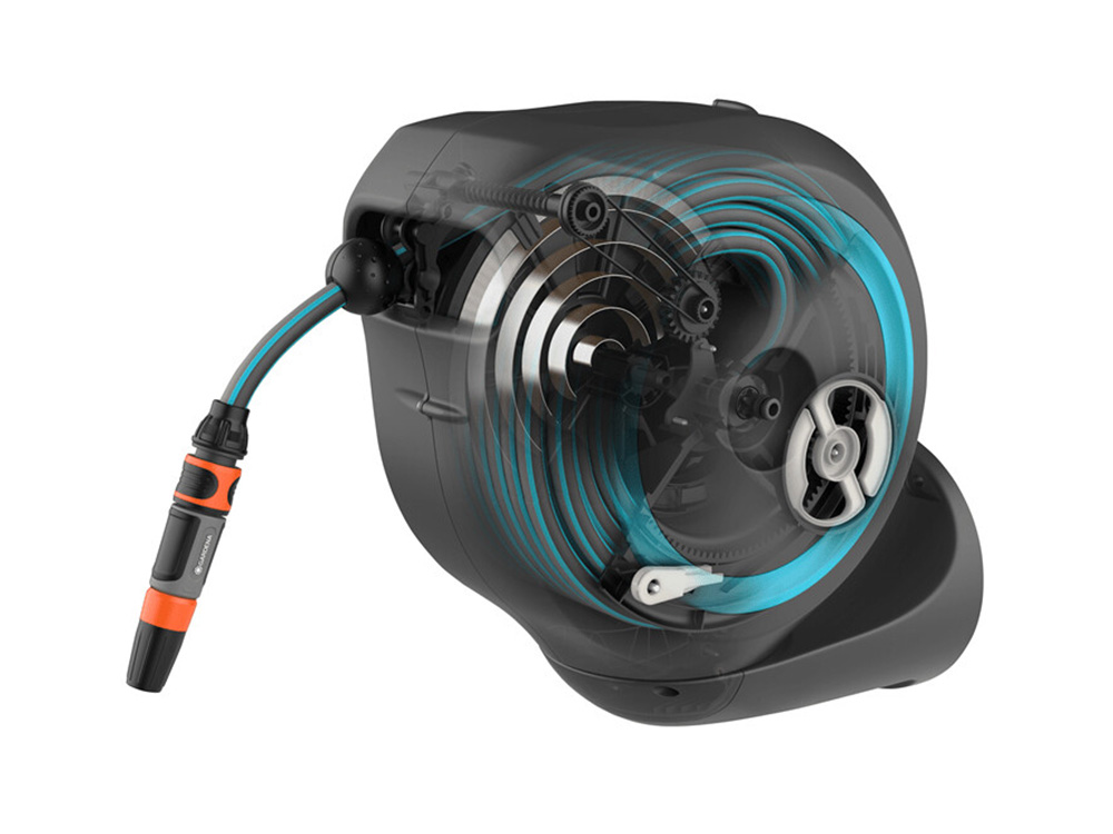 Der Gartenschlauch verriegelt sich automatisch in sehr kurzen Abständen, sobald Sie anhalten, was bedeutet, dass der Schlauch einfach und leicht zu handhaben ist. Ein leichtes Ziehen am Ende des Schlauchs entriegelt das System. Eine eingebaute Stahlfeder mit RollControl-Technologie sorgt für ein sanftes und kontrolliertes Rollen. Die RollControl schützt den Schlauchkasten und den umliegenden Bereich vor Schäden, die durch zu schnelles Einziehen entstehen. Um Knicke oder Knoten im Schlauch zu vermeiden, verfügt die Box über eine integrierte Schlauchführung.