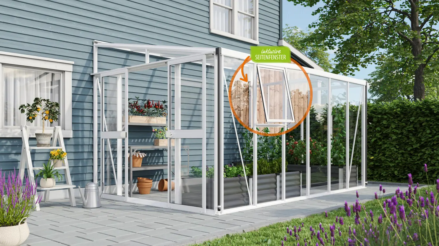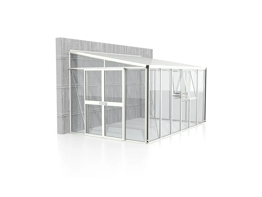 Die flexible doppelte Schiebetür (119 x 177 cm) kann nach Wunsch vorne oder seitlich angebracht werden und ist mit einem robusten Zylinderschloss ausgestattet. Das Gewächshaus verfügt serienmäßig über zwei Seitenfenster für optimale Belüftung, eine Regenentwässerungsrinne und zwei Fallrohre , um das Regenwasser effizient abzuleiten.