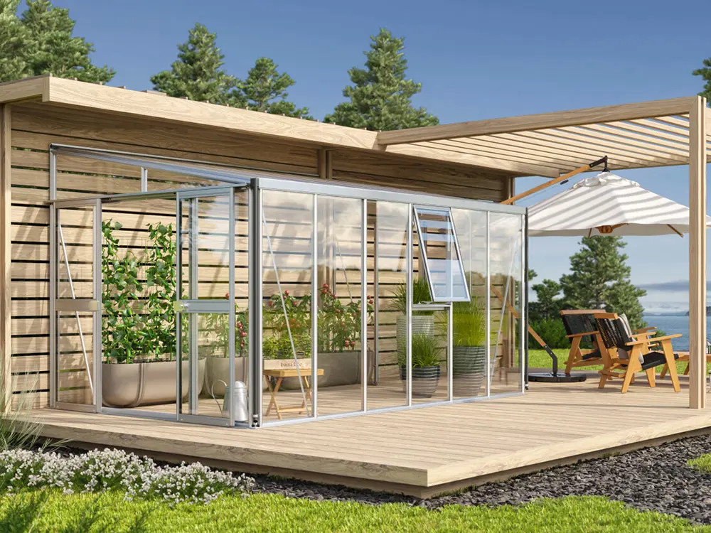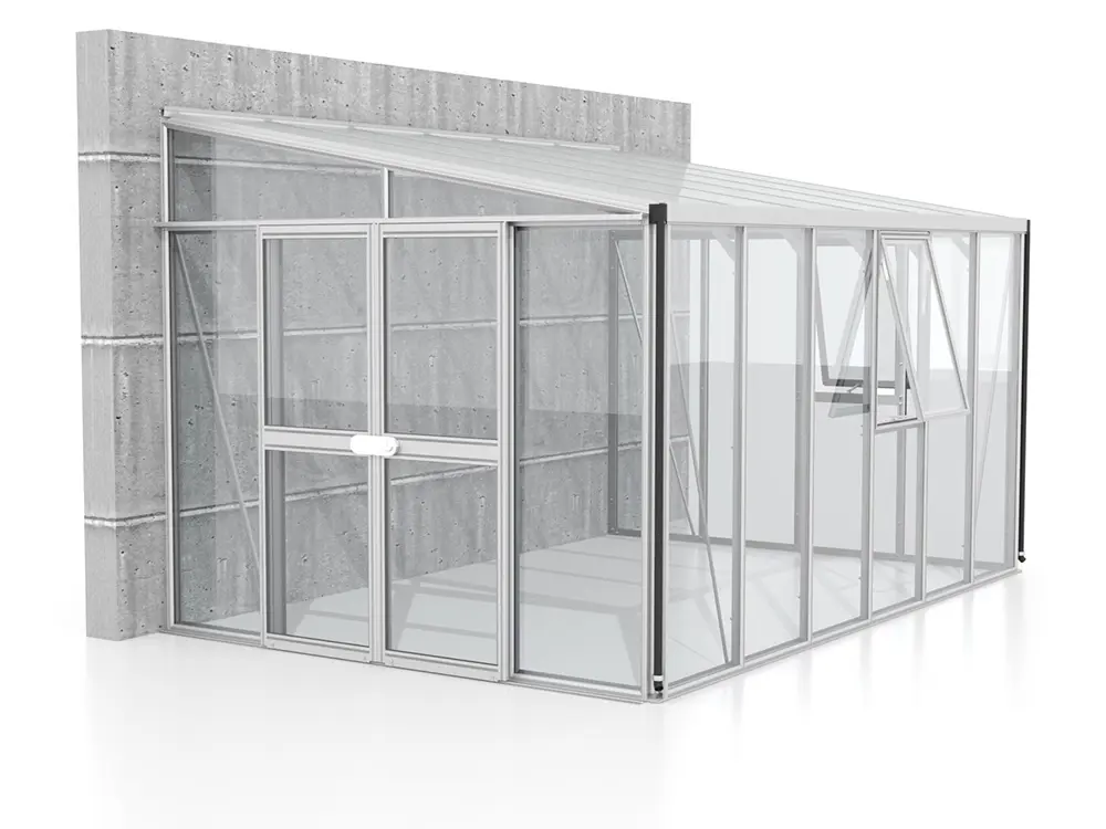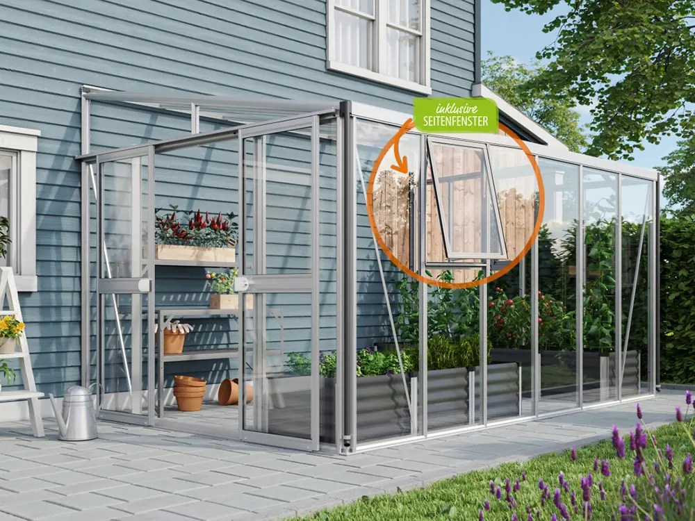 Dieses luxuriöse, wandmontierte Gewächshaus eignet sich perfekt zum Anbau von Obst und Gemüse, wird aber auch oft als zusätzliches Wohnzimmer genutzt, in dem Sie sich entspannen können. Das hochwertige Modell verfügt über einzigartige Doppelrahmenprofile, die zusätzliche Stabilität bieten.