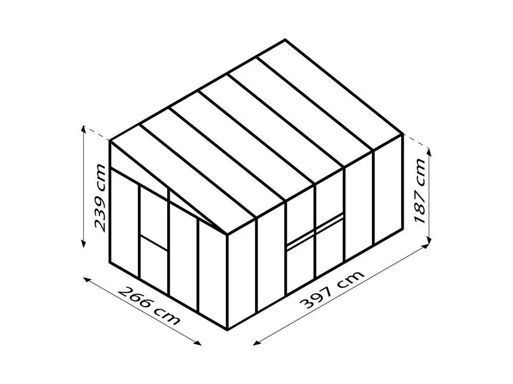 Die doppelte Schiebetür (119 x 177 cm) kann nach Wunsch seitlich oder vorne angebracht werden und ist mit einem stabilen Zylinderschloss ausgestattet. Die Standardausstattung umfasst außerdem zwei Seitenfenster, eine Regenwasserrinne und zwei Fallrohre.