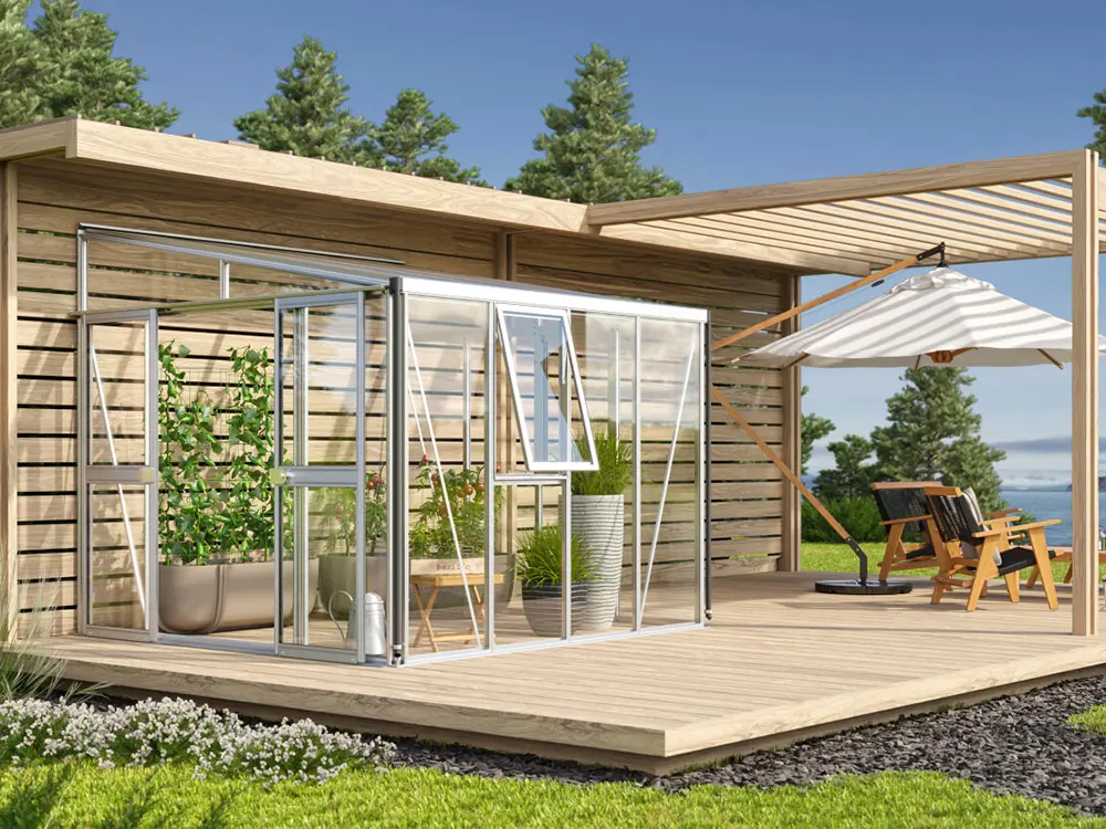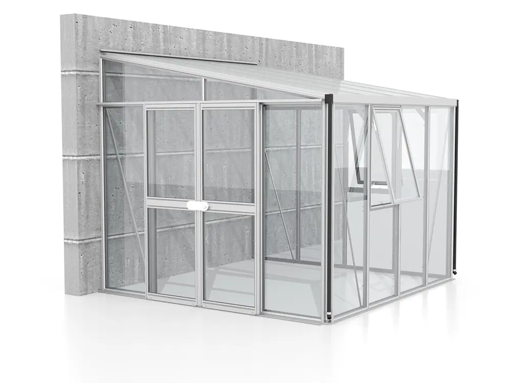 Dieses luxuriöse, wandmontierte Gewächshaus eignet sich perfekt zum Anbau von Obst und Gemüse, wird aber auch oft als zusätzliches Wohnzimmer genutzt, in dem Sie sich entspannen können. Das hochwertige Modell verfügt über einzigartige Doppelrahmenprofile, die zusätzliche Stabilität bieten.