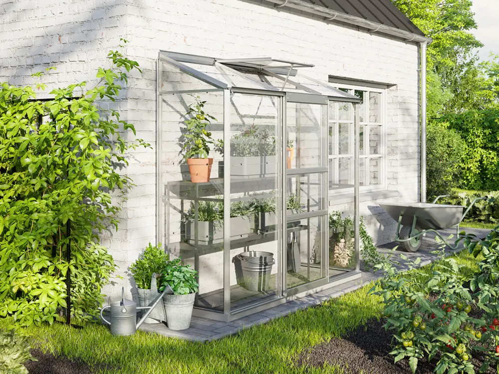 Das Ida 1300 Gewächshaus ist mit einer einzelnen Schiebetür und einem Oberlicht ausgestattet.