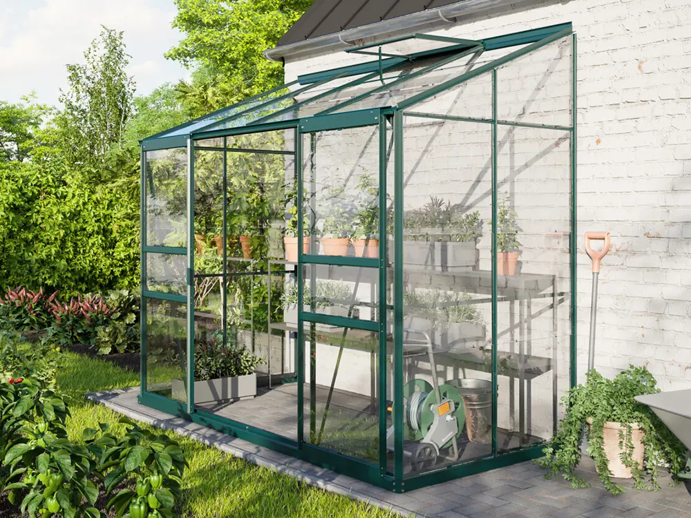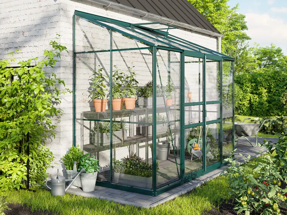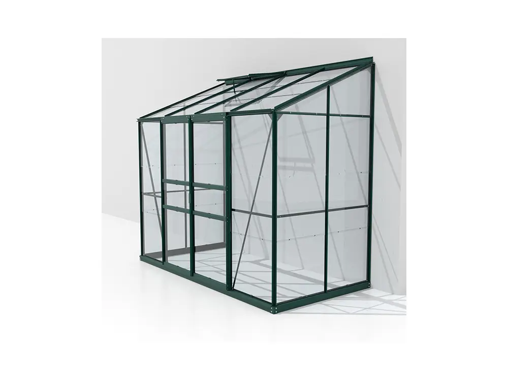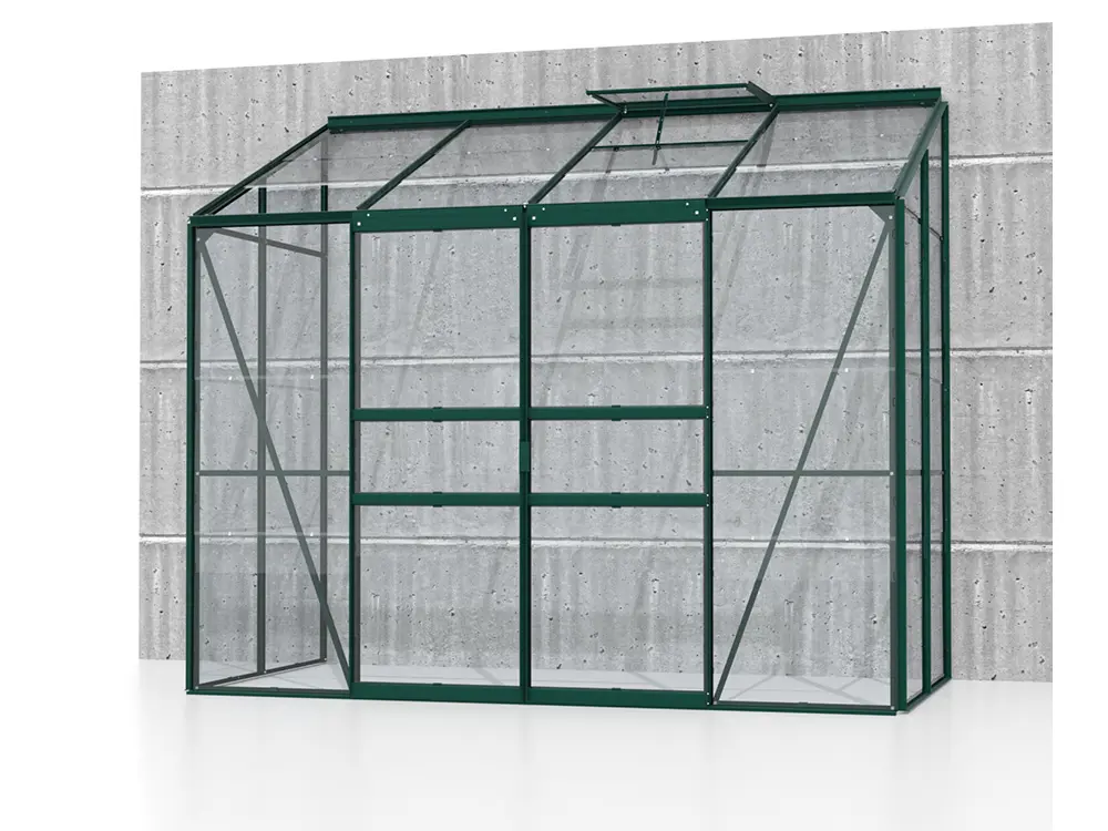 Die Profile bestehen aus pulverbeschichtetem grünem Aluminium, was dafür sorgt, dass sie immer wie neu aussehen. Der Rahmen ist serienmäßig mit 3 mm Sicherheitsglas ausgestattet. Als Option können Sie ein Stahlfundament wählen, das das Gewächshaus um 6 cm erhöht und so die Arbeit im Gewächshaus noch erleichtert. Darüber hinaus sorgt diese zusätzliche Foundation für eine glattere Konstruktion und ein stabileres Endergebnis.