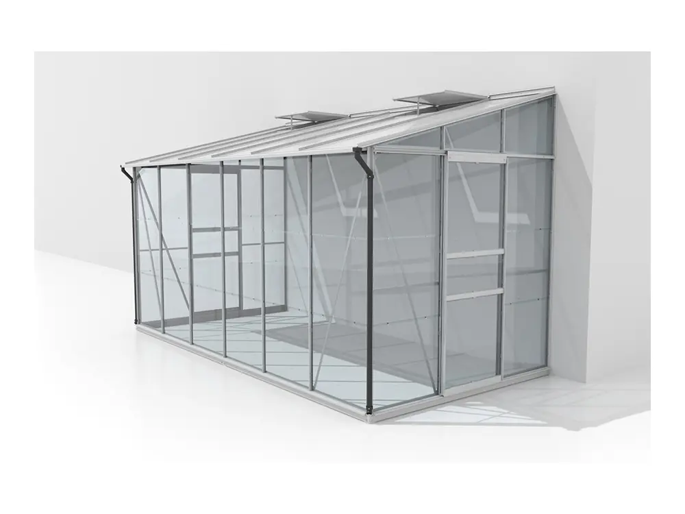 Die Ida 7800 ist mit einer doppelten Schiebetür und zwei Oberlichtern ausgestattet. Das Dach ist mit 6 mm dicken, UV-stabilisierten doppelwandigen Polycarbonatplatten ausgestattet.
