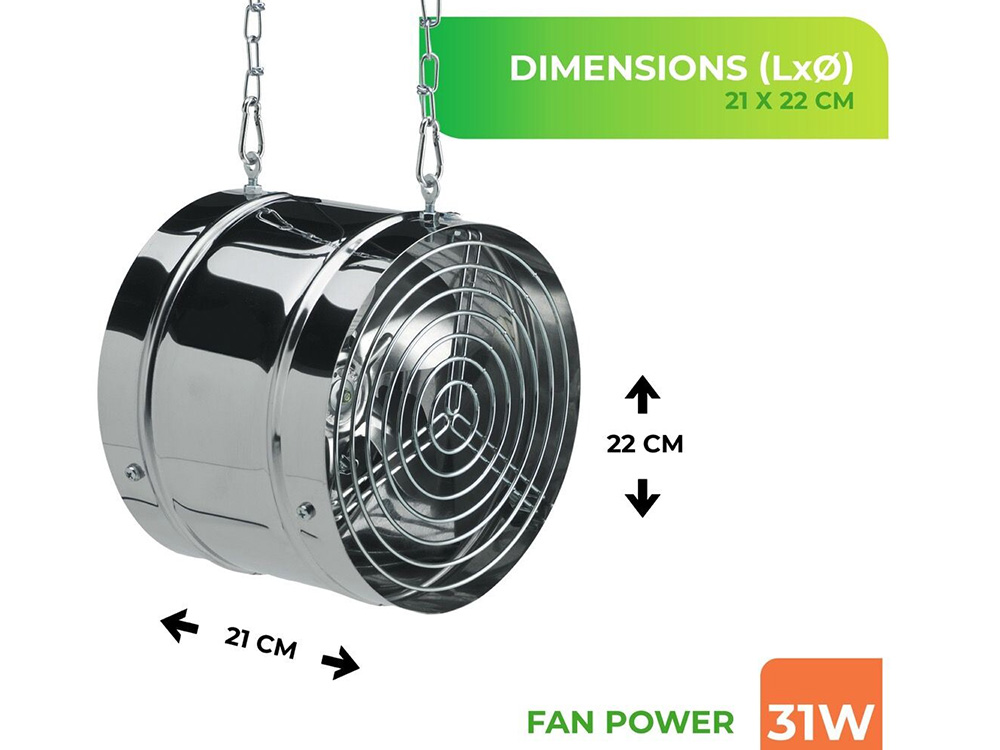 Der Ventilator ist mit einem Edelstahlgehäuse ausgestattet und widerstandsfähig gegen Wasserspritzer. Leiser Ventilator, um die Belüftung in Ihrem Gewächshaus zu stimulieren.