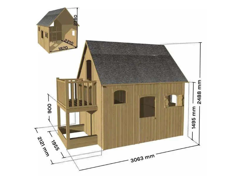 Das Duplex-Spielhaus bietet dank seiner großzügigen Innenräume von 4,13 m² (221 cm x 187 cm) bequem Platz für bis zu 8 Kinder. Der Anbau eines 1,46 m² großen Zwischengeschosses und eines Balkons mit 0,78 m² vergrößert den Spielbereich und schafft Zonen für verschiedene Aktivitäten. Alle Eingänge in Höhe sind mit Handläufen ausgestattet, um die Sicherheit der kleinen Abenteurer zu gewährleisten.