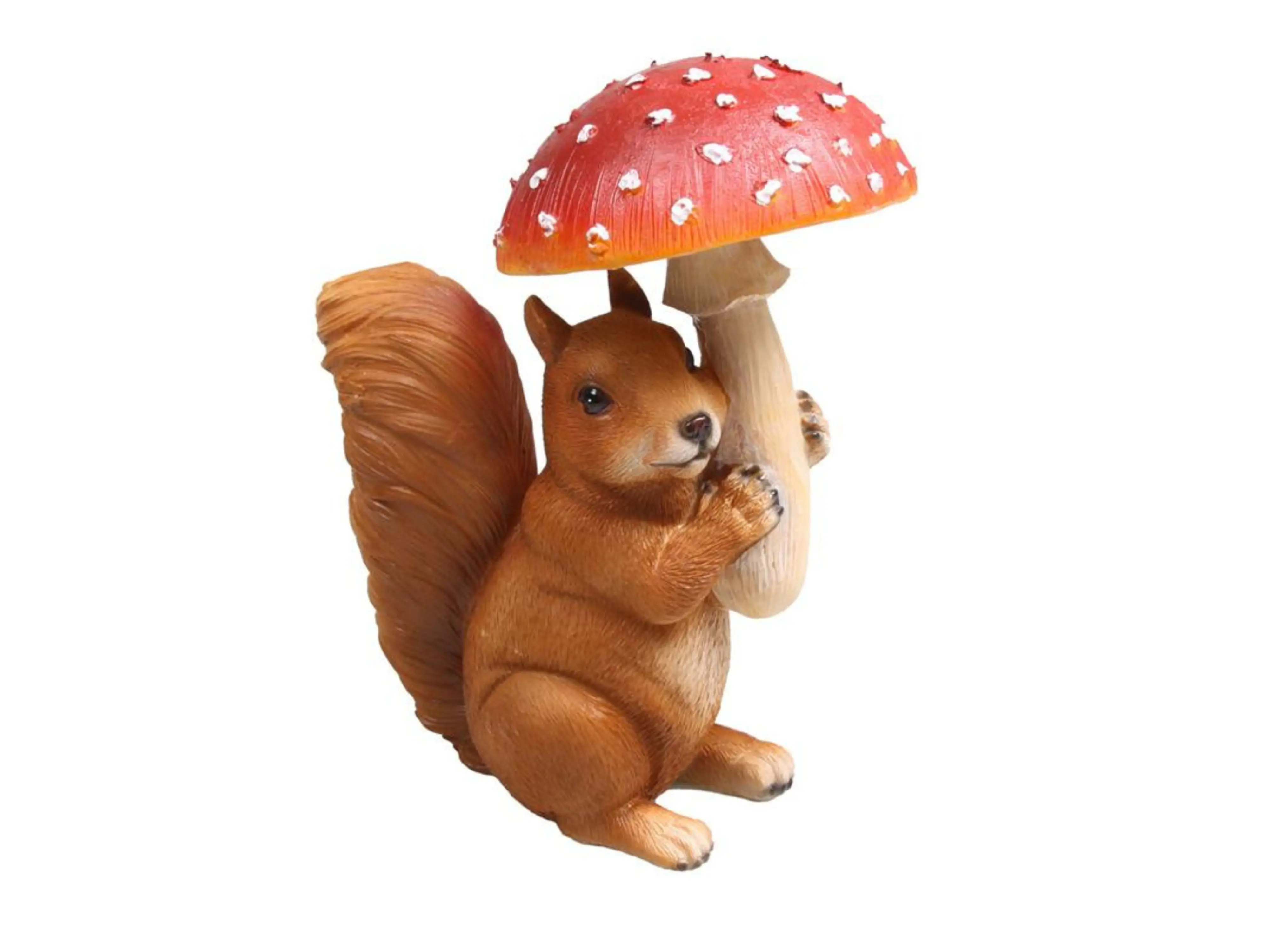 Verleihen Sie Ihrem Garten oder Inneren mit dieser Pilz-Eichhörnchenstatue einen verspielten und natürlichen Akzent. Das niedliche Eichhörnchen hält einen roten Fliegenpilz fest zwischen den Pfoten, wodurch die Figur sofort auffällt und eine fröhliche, waldige Atmosphäre ausstrahlt.