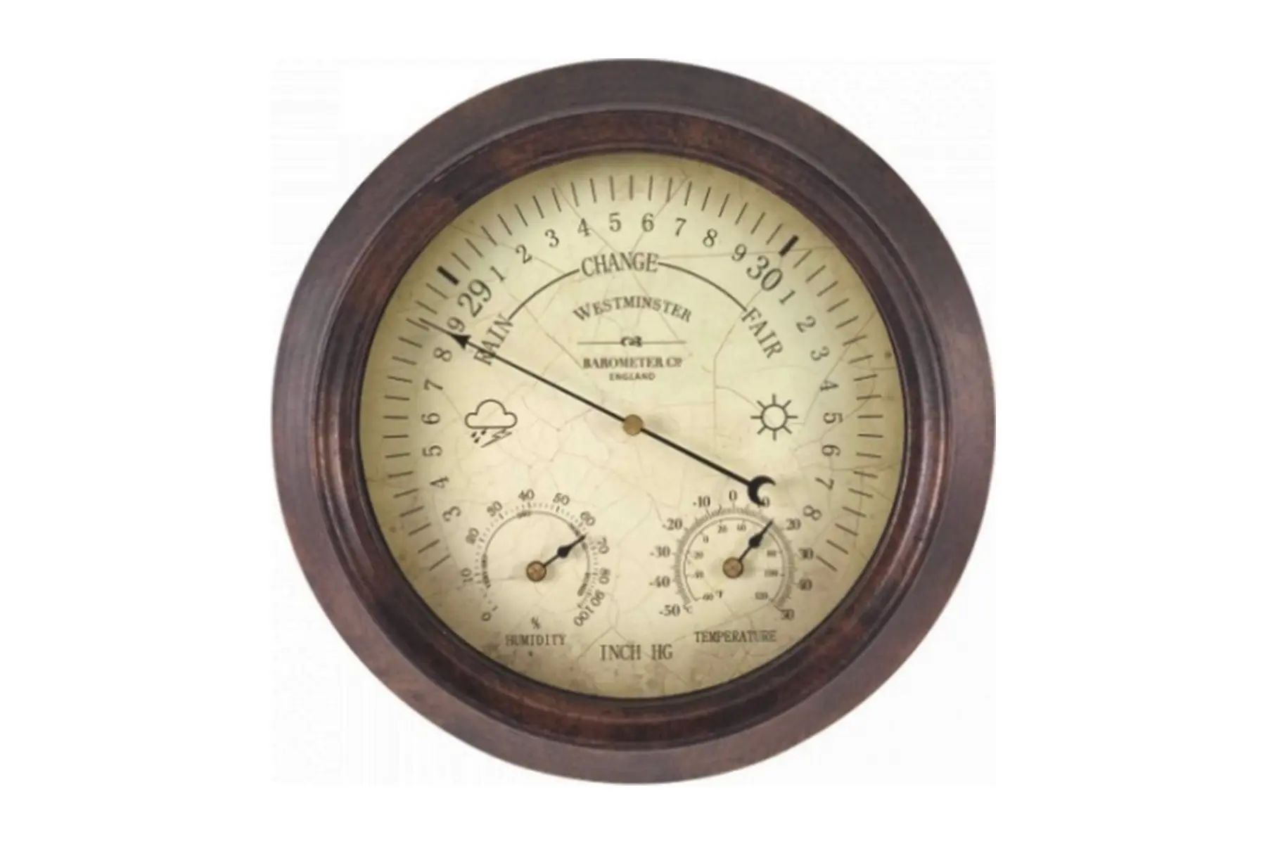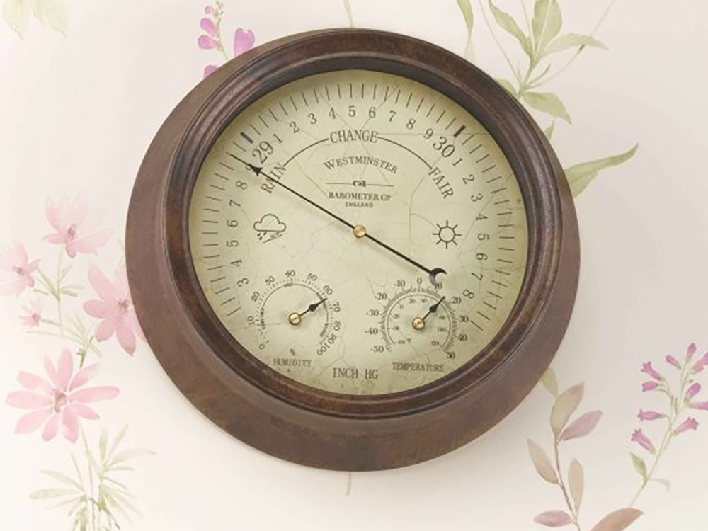 Das große Zifferblatt dieses Barometers zeigt den korrekten Luftdruck an, während zwei kleinere Regler Feuchtigkeit und Temperatur anzeigen. Die Temperatur kann sowohl in Grad Celsius als auch in Fahrenheit gemessen werden.
