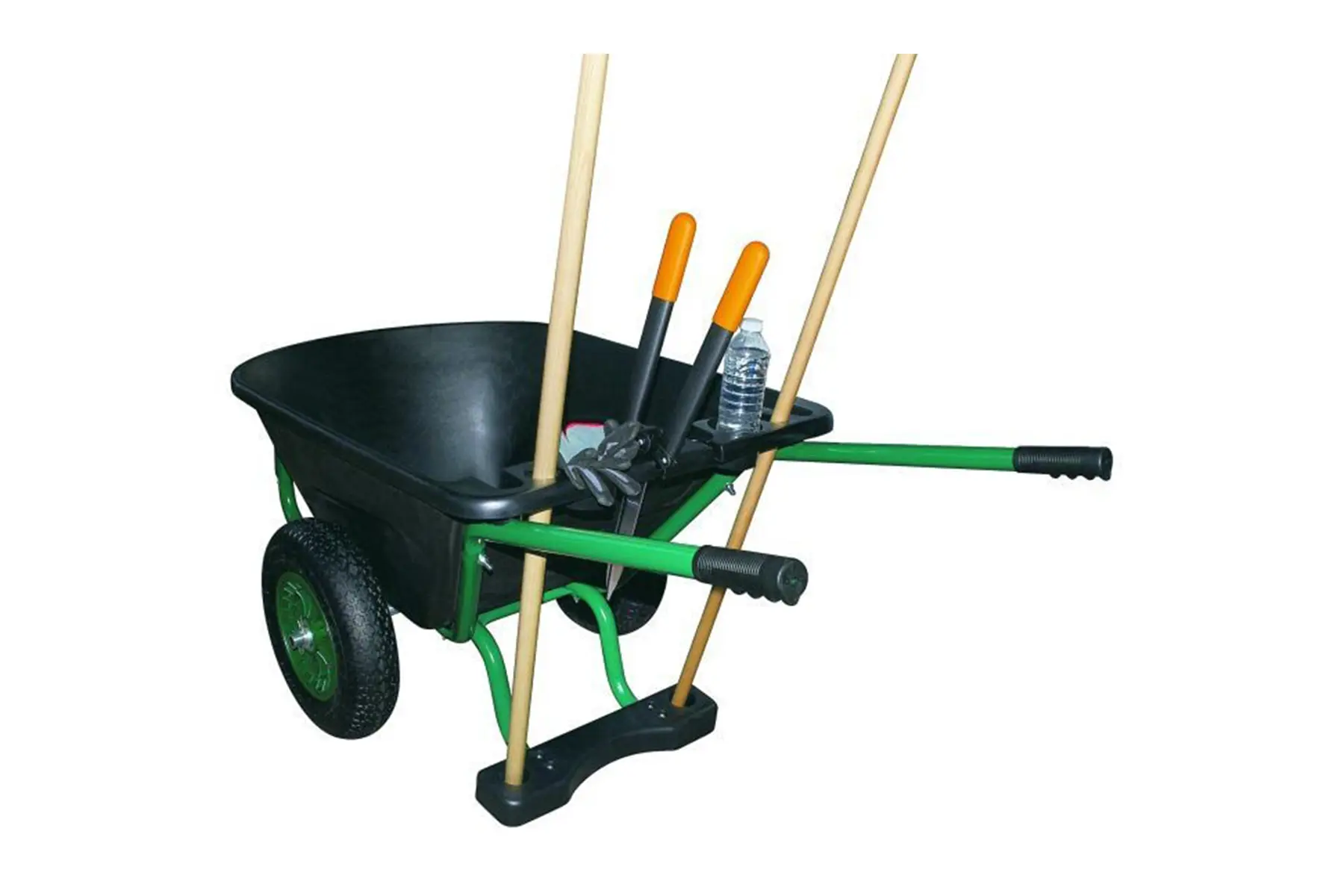 Zwischen den Griffen ist Platz, um kleine Gartengeräte wie Gartenscheren, Handschuhe oder eine Wasserflasche anzubringen. Am unteren Rand ist der Wagen mit einem Halter für Langgriffwerkzeuge ausgestattet.