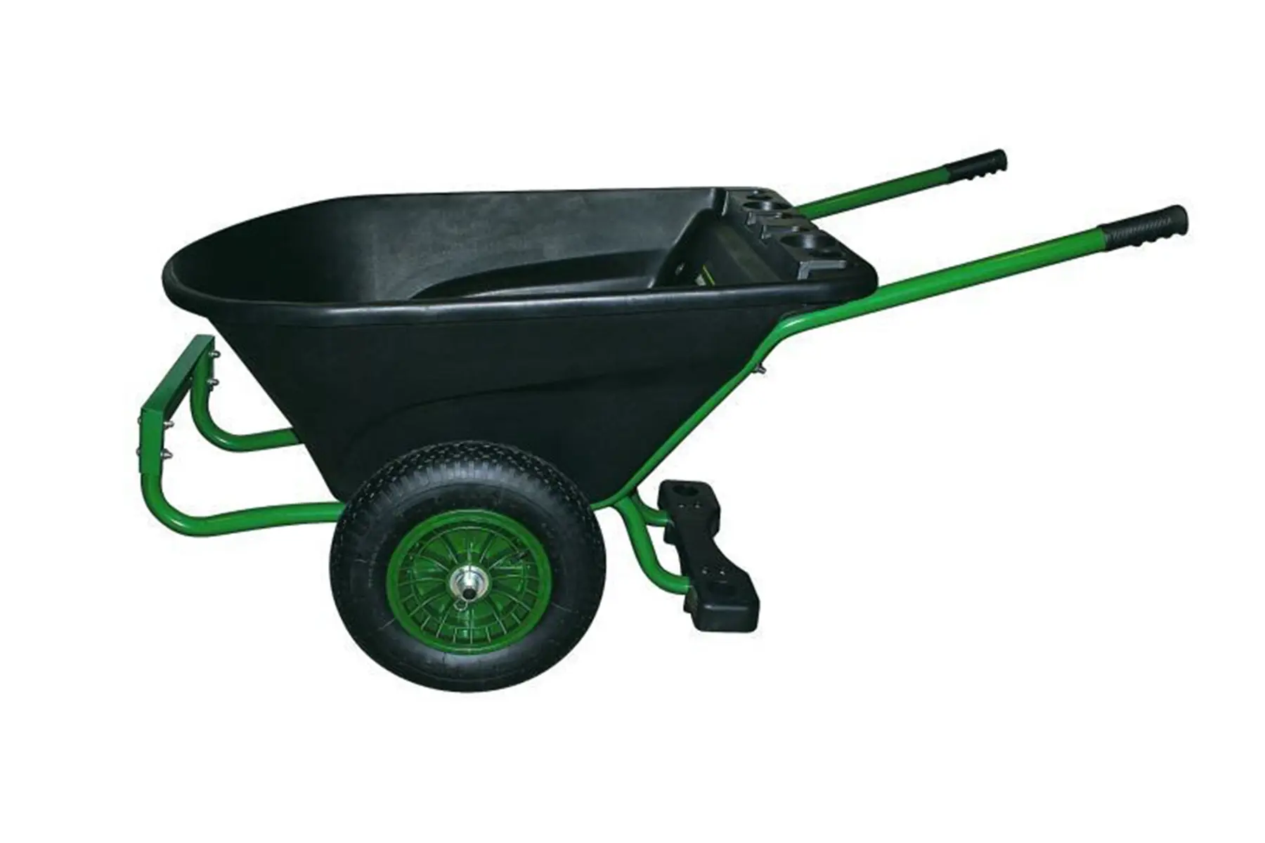 Praktischer Gartenwagen mit zwei Rädern und Werkzeughalter. Diese multifunktionale Schubkarre mit einem Hubraum von 125 Litern ist mit einem doppelten Radstand, stabilen Griffen und einer Frontabdeckung zum Schutz des Kastendrehgestells ausgestattet. Das verhindert, dass der Gartenwagen umkippt, und macht das Lenken leichter.