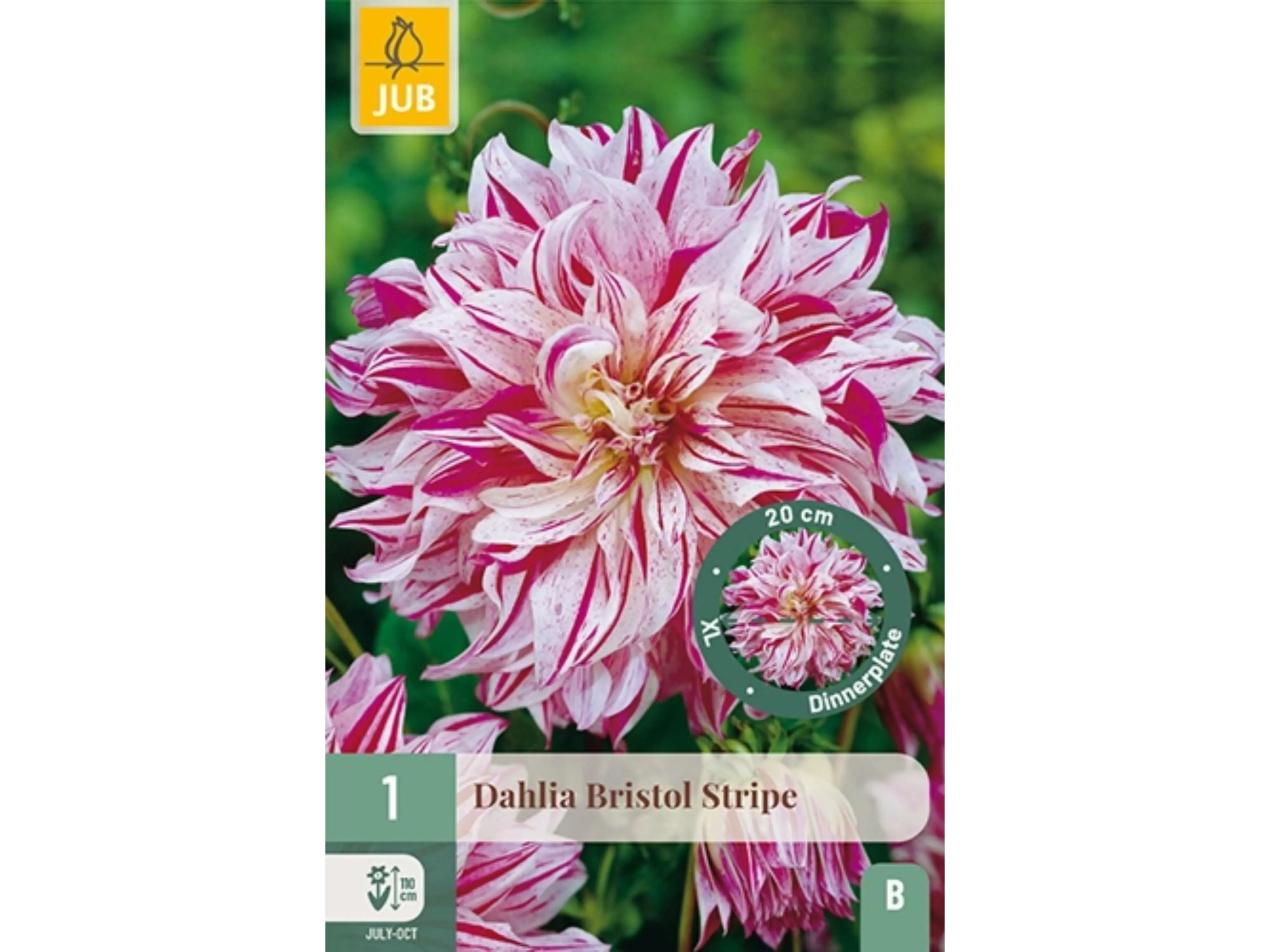 Die großblütige, dekorative Dahlia 'Bristol Stripe' ist eine lebhafte Sommerblüte, die monatelang Farbe und Atmosphäre in den Garten bringt. Von Juli bis zum ersten Frost erscheinen die auffälligen roten und weißen Blüten in voller Pracht. Die Pflanze erreicht eine Höhe von etwa 100–110 cm und kann bei starker Blüte manchmal zusätzliche Unterstützung benötigen.