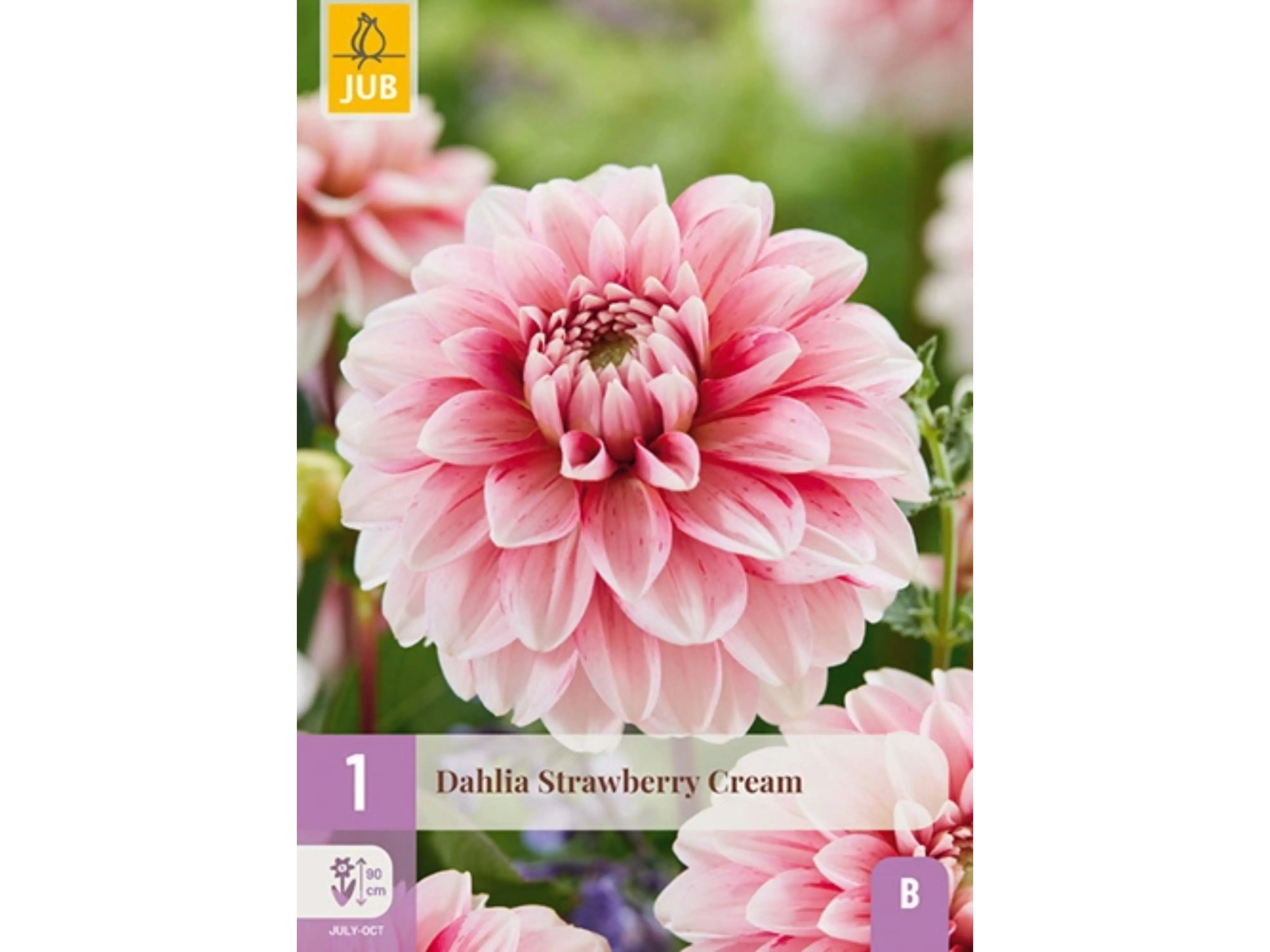 Bringen Sie Farbe und Eleganz in Ihren Garten mit der Dahlia Erdbeercreme. Diese großblütige, dekorative Dahlie bezaubert mit ihren creme-rosa, kugelförmigen Blüten und blüht von Juli bis zum ersten Frost üppig. Perfekt für Beete, aber auch ideal als Schnittblume für das Zuhause.